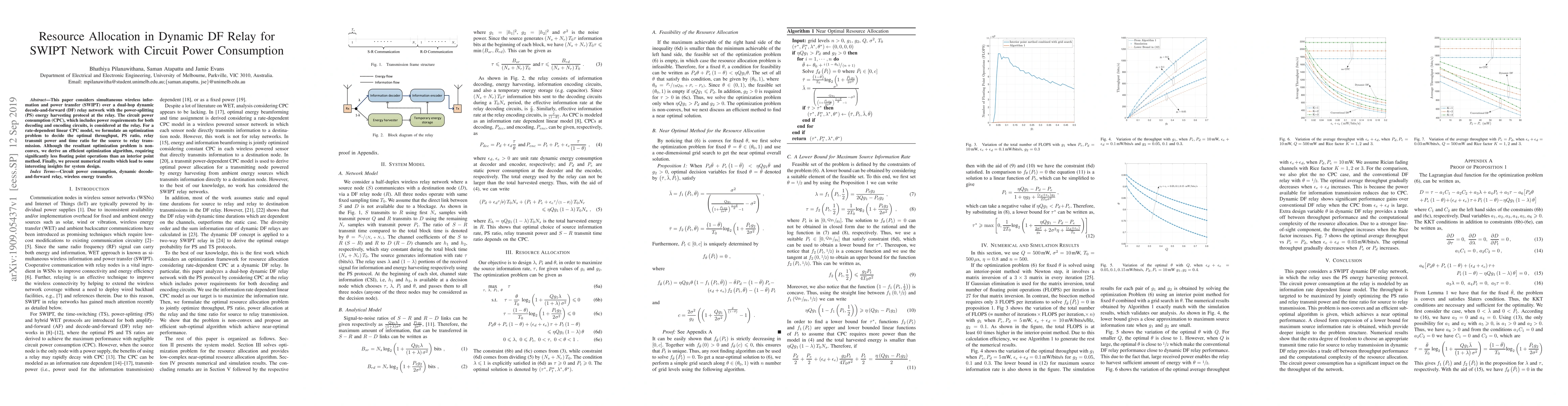 This paper optimizes resource allocation in a dual-hop dynamic DF relay network with SWIPT, considering circuit power consumption. An efficient optimization algorithm is derived to determine optimal throughput, power-splitting ratio, relay transmit power, and time ratio, outperforming traditional methods in computational efficiency.