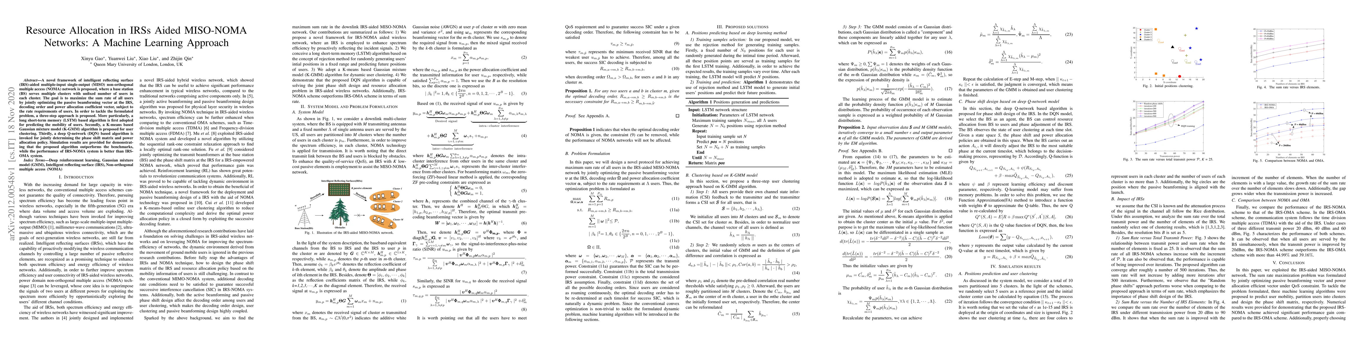 This paper proposes a machine learning framework for optimizing resource allocation in IRS-aided MISO-NOMA networks, using LSTM for user mobility prediction, K-GMM for clustering, and DQN for joint beamforming and power allocation. Simulation results show superior performance compared to benchmarks and indicate better outcomes than IRS-OMA systems.