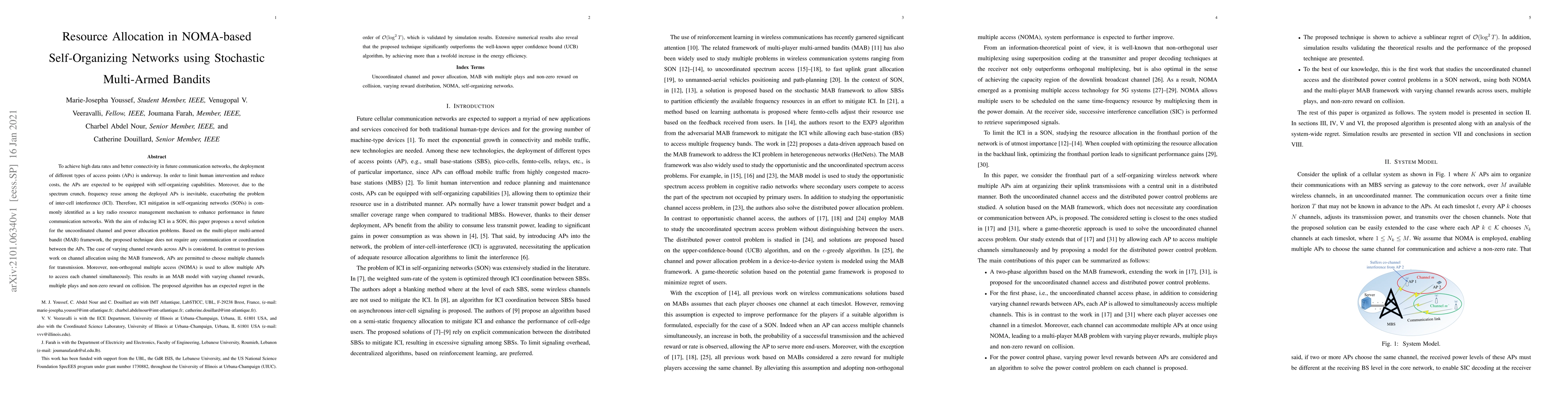 To achieve high data rates and better connectivity in future communication networks, the deployment of different types of access points (APs) is underway. In order to limit human intervention and reduce costs, the APs are expected to be equipped with self-organizing capabilities. Moreover, due to the spectrum crunch, frequency reuse among the deployed APs is inevitable, aggravating the problem of inter-cell interference (ICI). Therefore, ICI mitigation in self-organizing networks (SONs) is commonly identified as a key radio resource management mechanism to enhance performance in future communication networks. With the aim of reducing ICI in a SON, this paper proposes a novel solution for the uncoordinated channel and power allocation problems. Based on the multi-player multi-armed bandit (MAB) framework, the proposed technique does not require any communication or coordination between the APs. The case of varying channel rewards across APs is considered. In contrast to previous work on channel allocation using the MAB framework, APs are permitted to choose multiple channels for transmission. Moreover, non-orthogonal multiple access (NOMA) is used to allow multiple APs to access each channel simultaneously. This results in an MAB model with varying channel rewards, multiple plays and non-zero reward on collision. The proposed algorithm has an expected regret in the order of O(log^2 T ), which is validated by simulation results. Extensive numerical results also reveal that the proposed technique significantly outperforms the well-known upper confidence bound (UCB) algorithm, by achieving more than a twofold increase in the energy efficiency.
