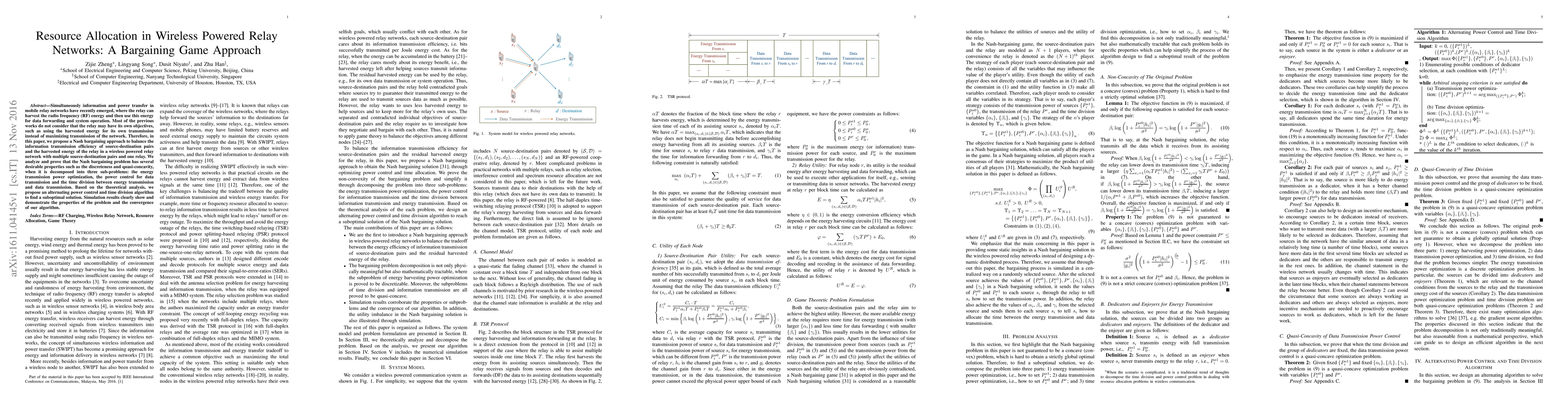 This paper proposes a Nash bargaining game approach to optimize resource allocation in wireless powered relay networks, balancing information transmission efficiency and relay energy usage. An alternating power control and time division algorithm is developed to find a suboptimal solution, demonstrating desirable properties and convergence through simulations.