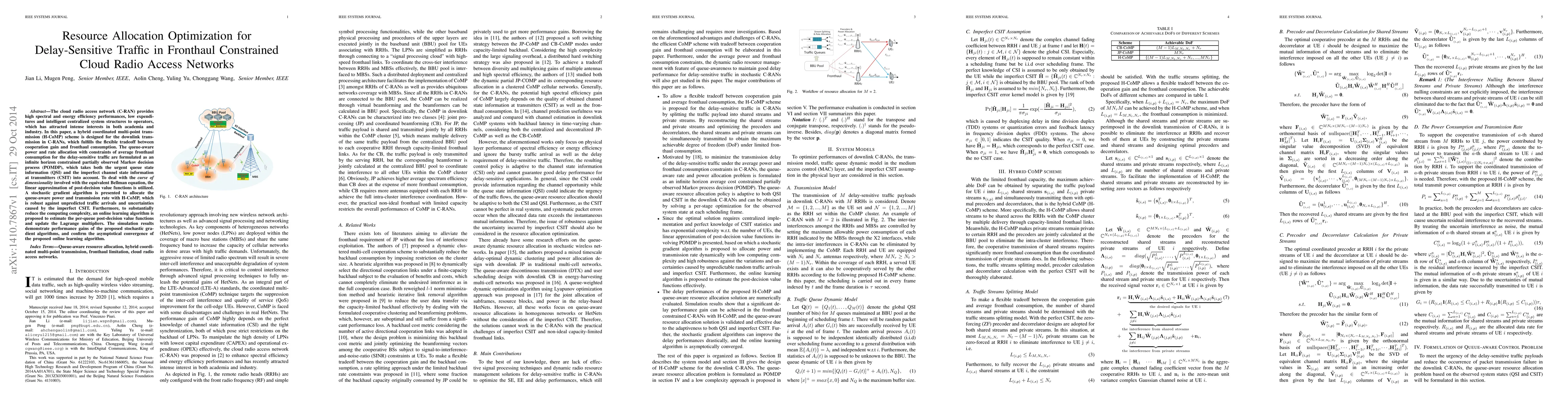 This paper proposes a hybrid coordinated multi-point transmission scheme for optimizing resource allocation in C-RANs to manage delay-sensitive traffic under fronthaul constraints. It formulates the problem as a POMDP and utilizes a stochastic gradient algorithm with online learning to efficiently allocate power and rate, demonstrating performance improvements and asymptotic convergence.