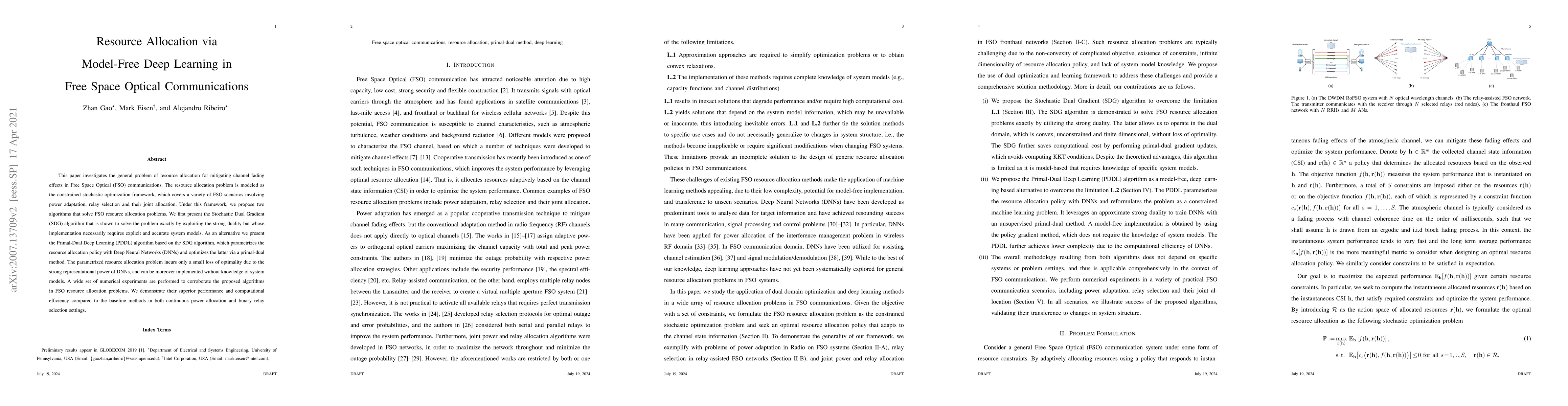 This paper proposes two algorithms for resource allocation in Free Space Optical (FSO) communications: the Stochastic Dual Gradient (SDG) algorithm and the Primal-Dual Deep Learning (PDDL) algorithm, which leverages Deep Neural Networks to optimize resource allocation without requiring explicit system models.