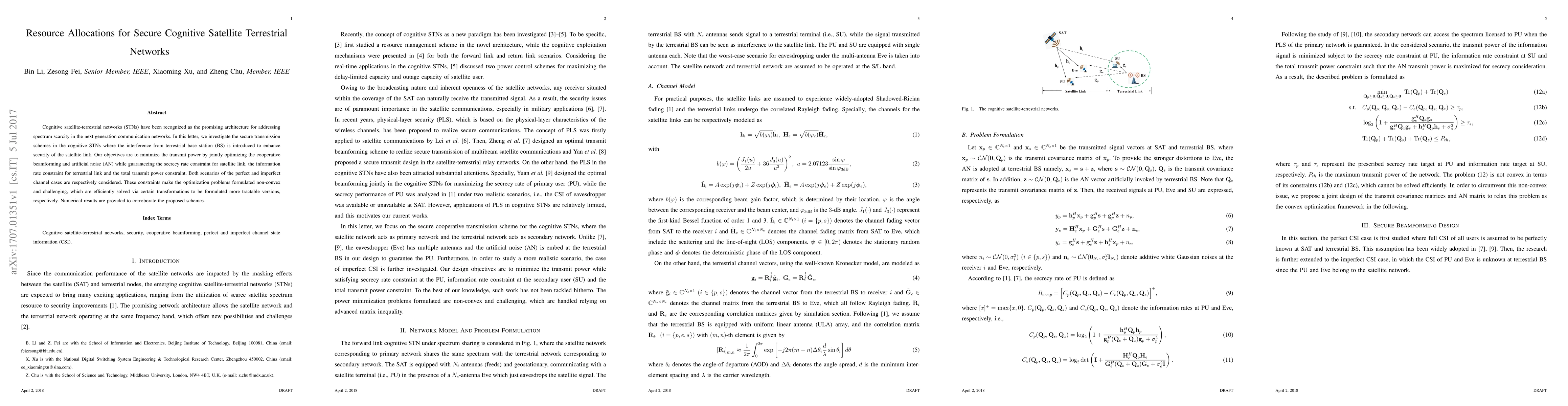 This paper explores secure transmission schemes in cognitive satellite-terrestrial networks to address spectrum scarcity, focusing on minimizing transmit power through cooperative beamforming and artificial noise. Optimization problems are solved efficiently despite non-convexity, and numerical results validate the proposed methods.