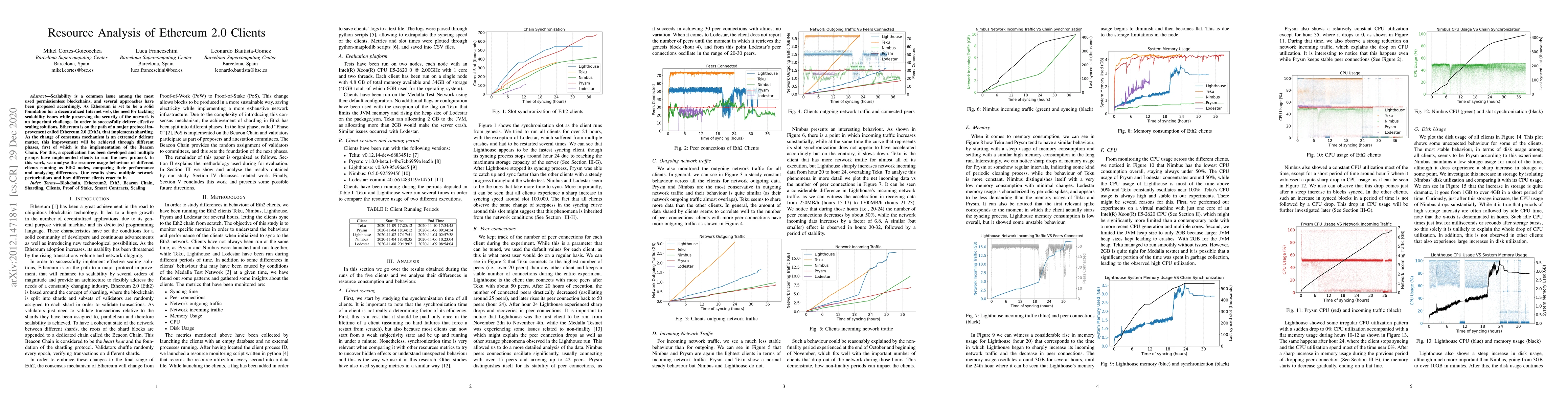 Scalability is a common issue among the most used permissionless blockchains, and several approaches have been proposed accordingly. As Ethereum is set to be a solid foundation for a decentralized Internet web, the need for tackling scalability issues while preserving the security of the network is an important challenge. In order to successfully deliver effective scaling solutions, Ethereum is on the path of a major protocol improvement called Ethereum 2.0 (Eth2), which implements sharding. As the change of consensus mechanism is an extremely delicate matter, this improvement will be achieved through different phases, the first of which is the implementation of the Beacon Chain. For this, a specification has been developed and multiple groups have implemented clients to run the new protocol. In this work, we analyse the resource usage behaviour of different clients running as Eth2 nodes, comparing their performance and analysing differences. Our results show multiple network perturbations and how different clients react to it.