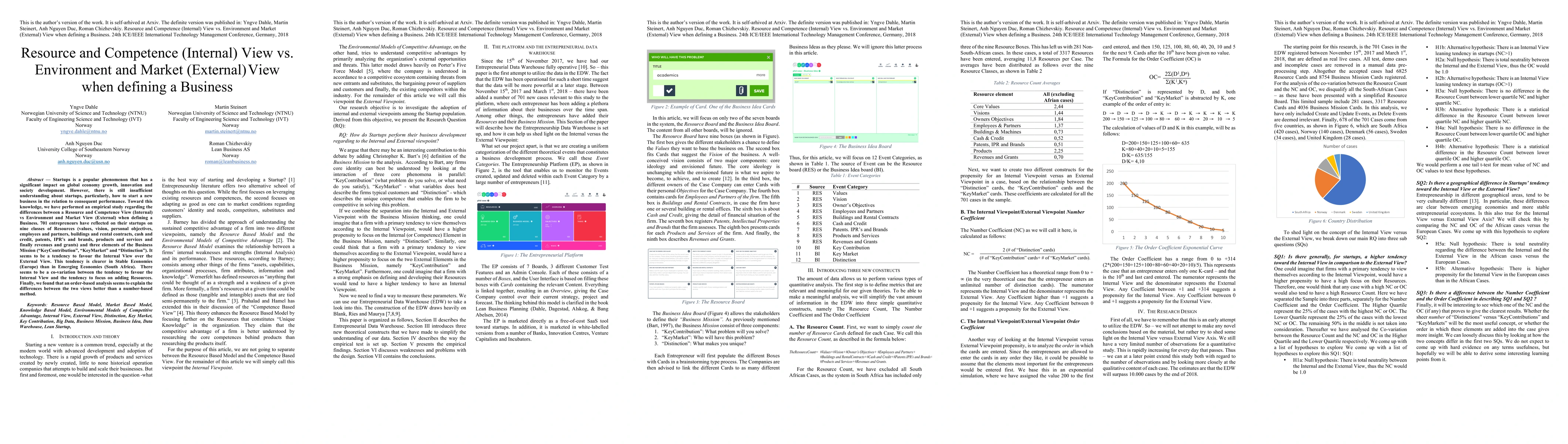 Startups is a popular phenomenon that has a significant impact on global economy growth, innovation and society development. However, there is still insufficient understanding about startups, particularly, how to start a new business in the relation to consequent performance. Toward this knowledge, we have performed an empirical study regarding the differences between a Resource and Competence View (Internal) vs Environment and Market View (External) when defining a Business. 701 entrepreneurs have reflected on their startups on nine classes of Resources (values, vision, personal objectives, employees and partners, buildings and rental contracts, cash and credit, patents, IPR's and brands, products and services and finally revenues and grants) and three elements of the Business Mission ("KeyContribution", "KeyMarket" and "Distinction"). It seems to be a tendency to favour the Internal View over the External View. This tendency is clearer in Stable Economies (Europe) than in Emerging Economies (South Africa). There seems to be a co-variation between the tendency to favour the Internal View and the tendency to focus on adding Resources. Finally, we found that an order-based analysis seems to explain the differences between the two views better than a number-based method.
