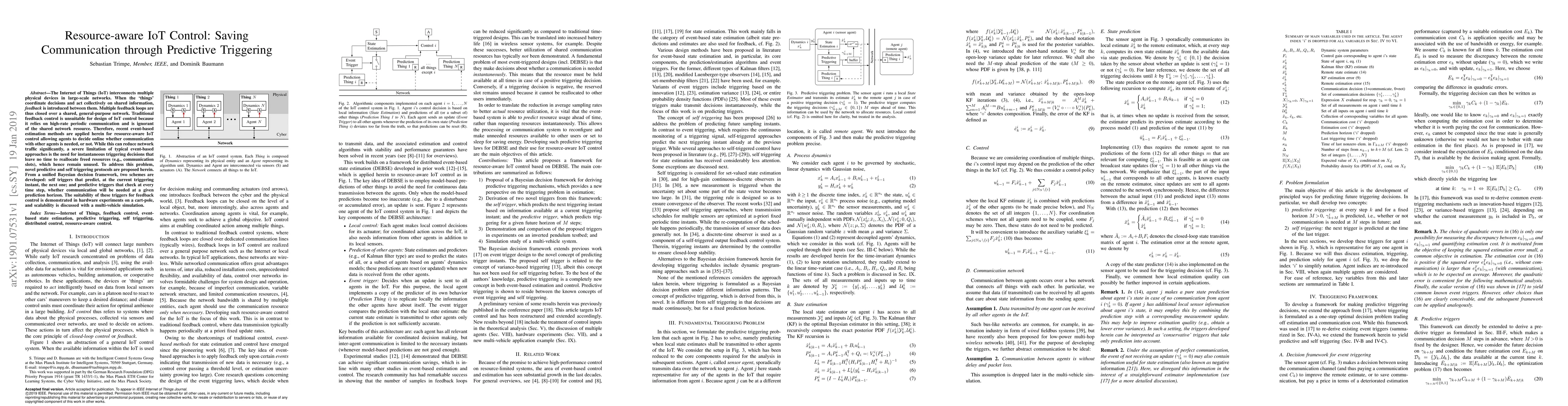 This paper proposes predictive and self-triggering protocols to reduce communication in IoT control by deciding online if communication is needed, addressing the limitations of traditional event-based methods that cannot reallocate unused resources. The effectiveness of these triggers is demonstrated through hardware experiments on a cart-pole and multi-vehicle simulations.