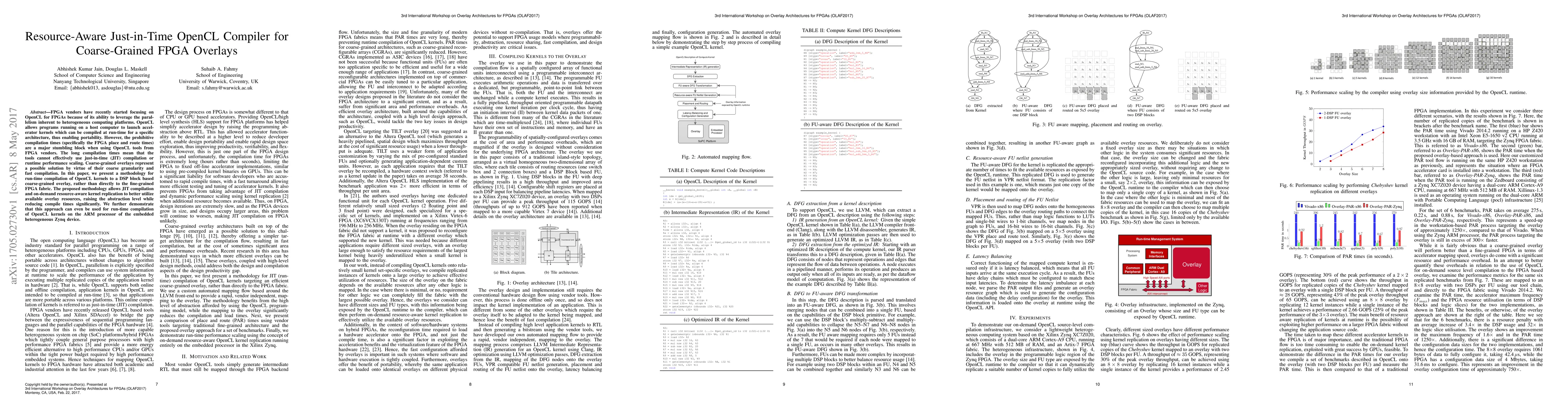 This paper introduces a resource-aware just-in-time OpenCL compiler for coarse-grained FPGA overlays, significantly reducing compilation times by compiling OpenCL kernels to DSP block overlays instead of the fine-grained FPGA fabric, thus enabling efficient runtime performance scaling and kernel replication.