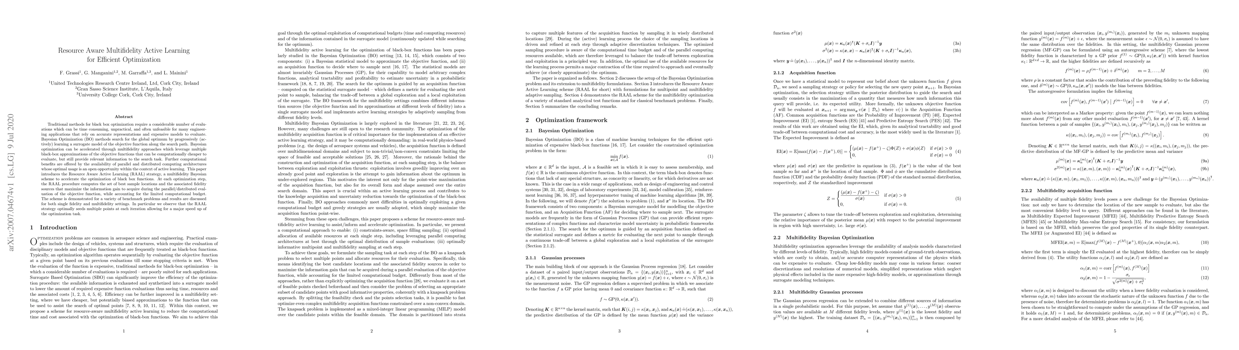 Traditional methods for black box optimization require a considerable number of evaluations which can be time consuming, unpractical, and often unfeasible for many engineering applications that rely on accurate representations and expensive models to evaluate. Bayesian Optimization (BO) methods search for the global optimum by progressively (actively) learning a surrogate model of the objective function along the search path. Bayesian optimization can be accelerated through multifidelity approaches which leverage multiple black-box approximations of the objective functions that can be computationally cheaper to evaluate, but still provide relevant information to the search task. Further computational benefits are offered by the availability of parallel and distributed computing architectures whose optimal usage is an open opportunity within the context of active learning. This paper introduces the Resource Aware Active Learning (RAAL) strategy, a multifidelity Bayesian scheme to accelerate the optimization of black box functions. At each optimization step, the RAAL procedure computes the set of best sample locations and the associated fidelity sources that maximize the information gain to acquire during the parallel/distributed evaluation of the objective function, while accounting for the limited computational budget. The scheme is demonstrated for a variety of benchmark problems and results are discussed for both single fidelity and multifidelity settings. In particular we observe that the RAAL strategy optimally seeds multiple points at each iteration allowing for a major speed up of the optimization task.