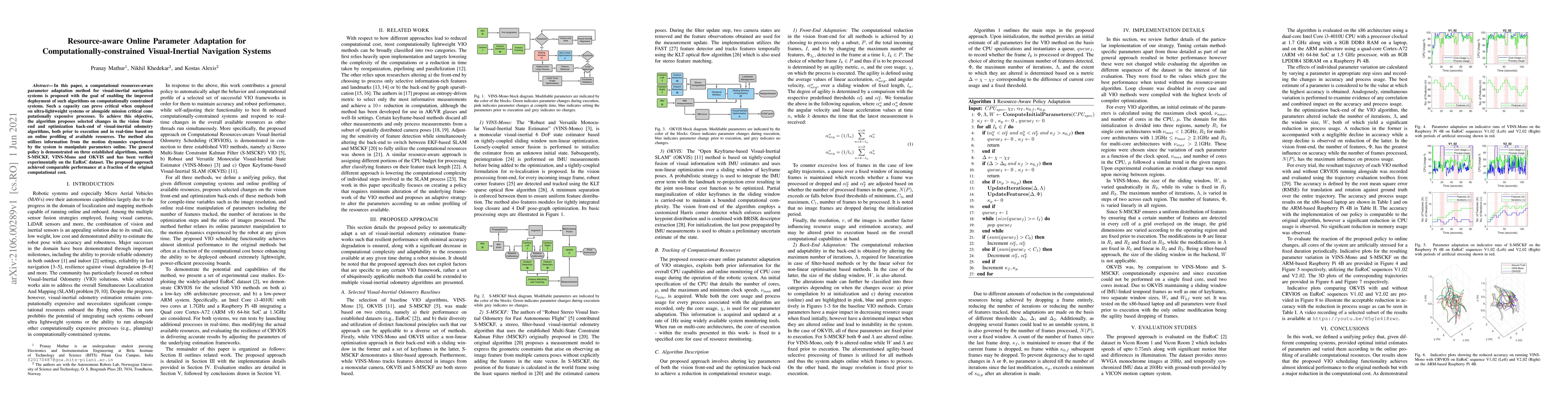 In this paper, a computational resources-aware parameter adaptation method for visual-inertial navigation systems is proposed with the goal of enabling the improved deployment of such algorithms on computationally constrained systems. Such a capacity can prove critical when employed on ultra-lightweight systems or alongside mission critical computationally expensive processes. To achieve this objective, the algorithm proposes selected changes in the vision front-end and optimization back-end of visual-inertial odometry algorithms, both prior to execution and in real-time based on an online profiling of available resources. The method also utilizes information from the motion dynamics experienced by the system to manipulate parameters online. The general policy is demonstrated on three established algorithms, namely S-MSCKF, VINS-Mono and OKVIS and has been verified experimentally on the EuRoC dataset. The proposed approach achieved comparable performance at a fraction of the original computational cost.