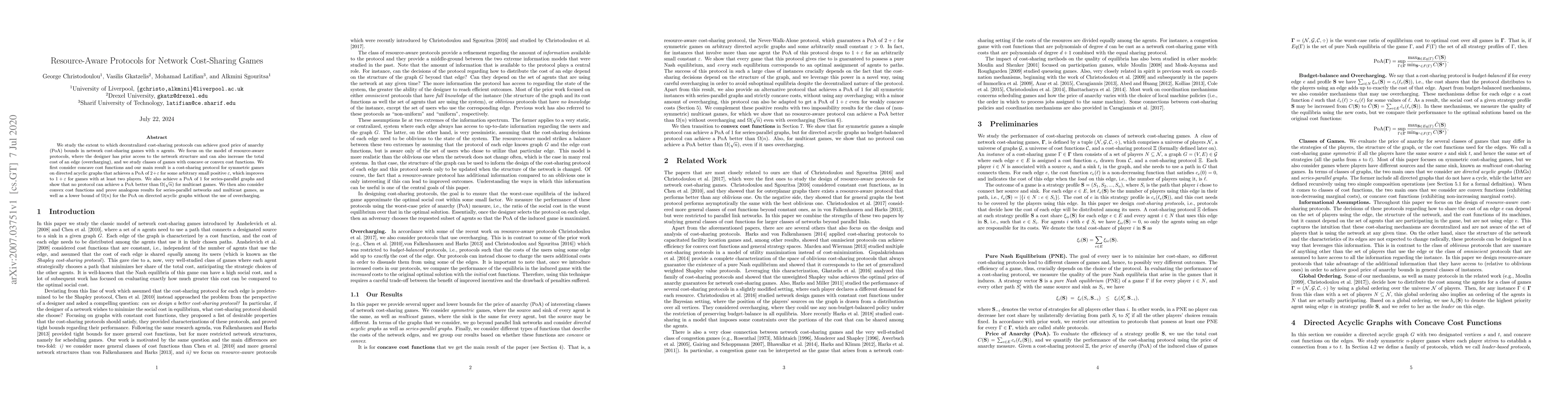This paper explores resource-aware protocols for network cost-sharing games, achieving improved price of anarchy (PoA) bounds for concave and convex cost functions. It demonstrates optimal PoA for symmetric games on directed acyclic graphs and series-parallel networks, while establishing lower bounds for multicast games.