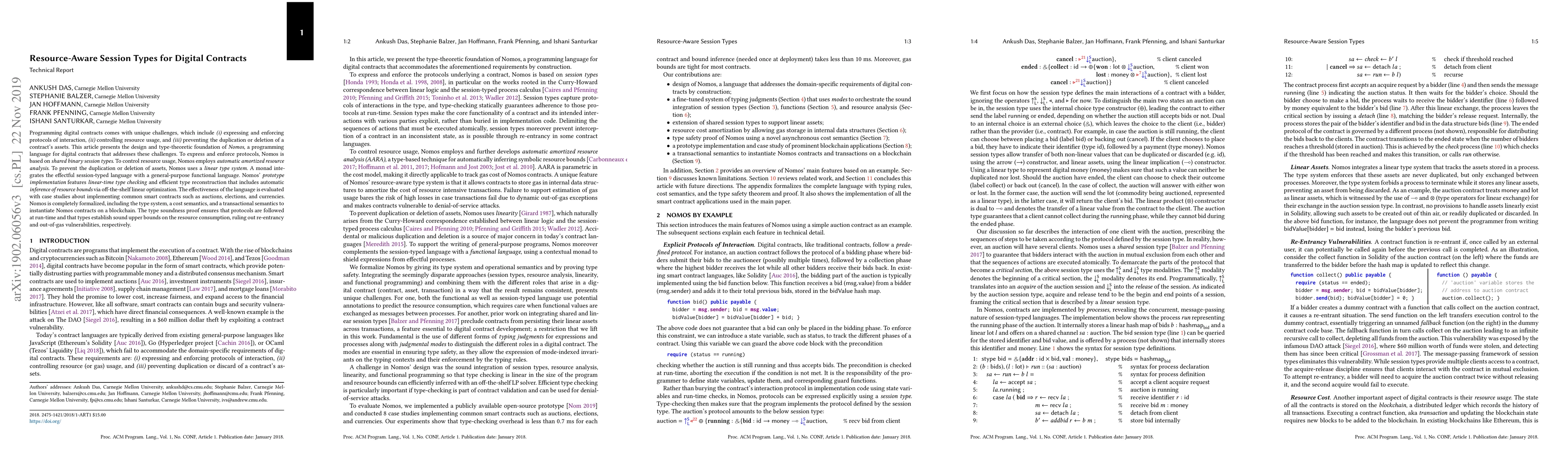 The paper presents Nomos, a programming language for digital contracts, designed to address challenges in expressing interaction protocols, controlling resource usage, and preventing duplication or deletion of assets. It employs shared binary session types, automatic amortized resource analysis, and a linear type system integrated with a functional language via a monad.