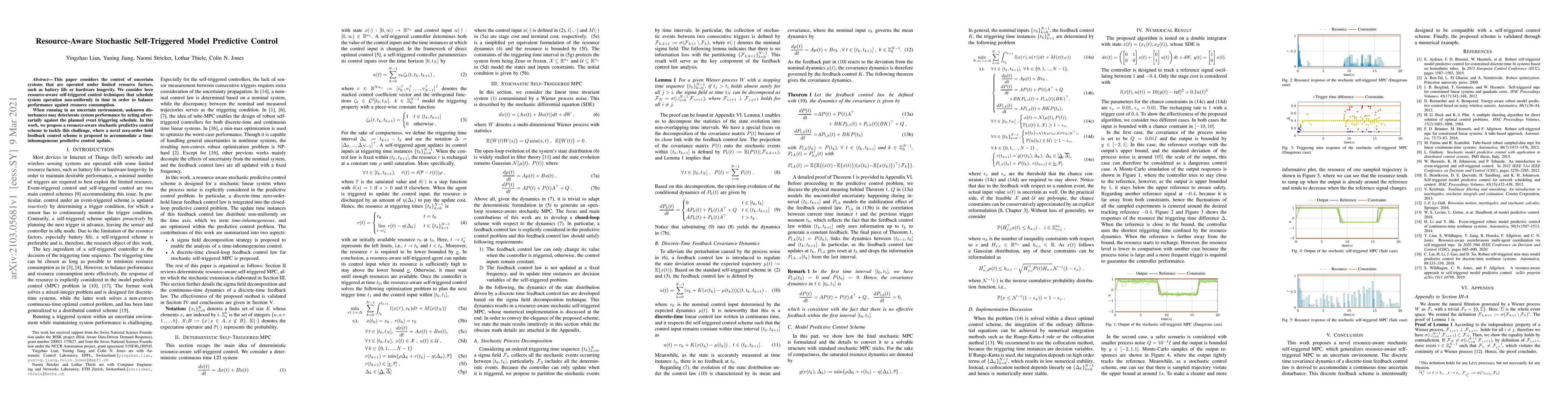 This paper considers the control of uncertain systems that are operated under limited resource factors, such as battery life or hardware longevity. We consider here resource-aware self-triggered control techniques that schedule system operation non-uniformly in time in order to balance performance against resource consumption. When running in an uncertain environment, unknown disturbances may deteriorate system performance by acting adversarially against the planned event triggering schedule. In this work, we propose a resource-aware stochastic predictive control scheme to tackle this challenge, where a novel zero-order hold feedback control scheme is proposed to accommodate a time-inhomogeneous predictive control update.