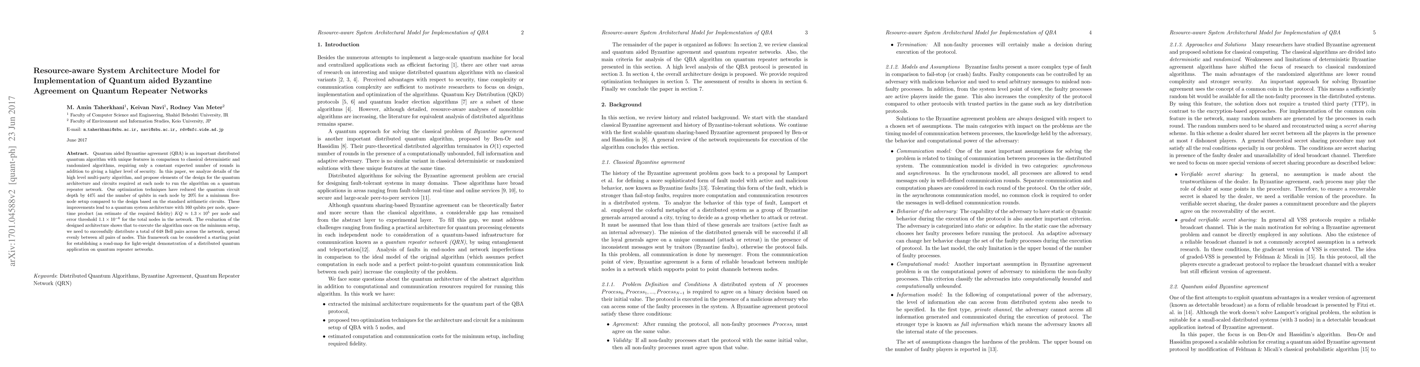 Quantum aided Byzantine agreement (QBA) is an important distributed quantum algorithm with unique features in comparison to classical deterministic and randomized algorithms, requiring only a constant expected number of rounds in addition to giving higher level of security. In this paper, we analyze details of the high level multi-party algorithm, and propose elements of the design for the quantum architecture and circuits required at each node to run the algorithm on a quantum repeater network. Our optimization techniques have reduced the quantum circuit depth by 44\% and the number of qubits in each node by 20\% for a minimum five-node setup compared to the design based on the standard arithmetic circuits. These improvements lead to an architecture with $KQ \approx 1.3 \times 10^{5}$ per node and error threshold $1.1 \times 10^{-6}$ for the total nodes in the network. The evaluation of the designed architecture shows that to execute the algorithm once on the minimum setup, we need to successfully distribute a total of 648 Bell pairs across the network, spread evenly between all pairs of nodes. This framework can be considered a starting point for establishing a road-map for light-weight demonstration of a distributed quantum application on quantum repeater networks.