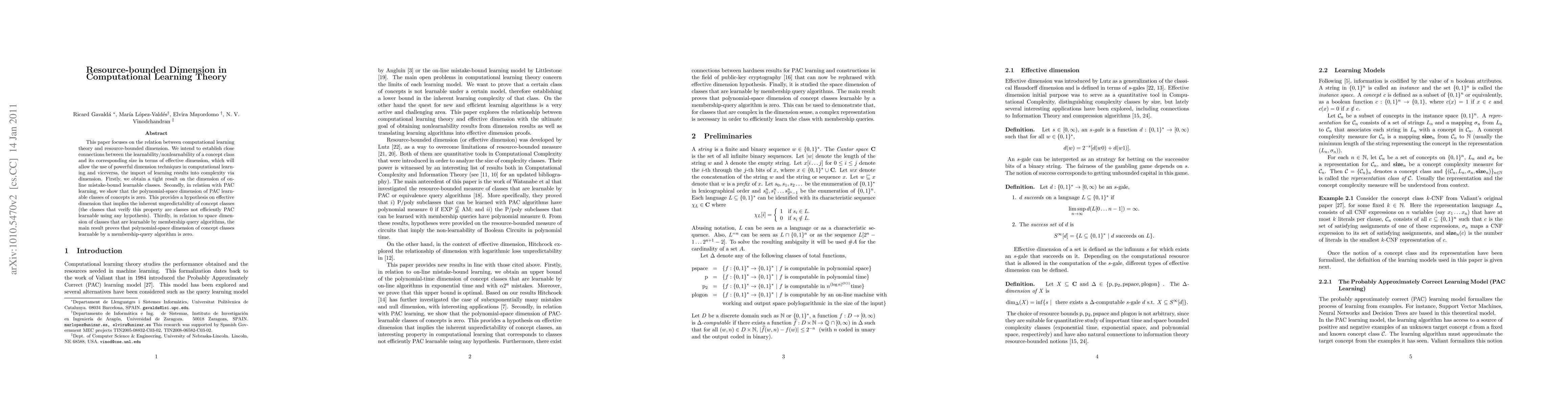This paper focuses on the relation between computational learning theory and resource-bounded dimension. We intend to establish close connections between the learnability/nonlearnability of a concept class and its corresponding size in terms of effective dimension, which will allow the use of powerful dimension techniques in computational learning and viceversa, the import of learning results into complexity via dimension. Firstly, we obtain a tight result on the dimension of online mistake-bound learnable classes. Secondly, in relation with PAC learning, we show that the polynomial-space dimension of PAC learnable classes of concepts is zero. This provides a hypothesis on effective dimension that implies the inherent unpredictability of concept classes (the classes that verify this property are classes not efficiently PAC learnable using any hypothesis). Thirdly, in relation to space dimension of classes that are learnable by membership query algorithms, the main result proves that polynomial-space dimension of concept classes learnable by a membership-query algorithm is zero.