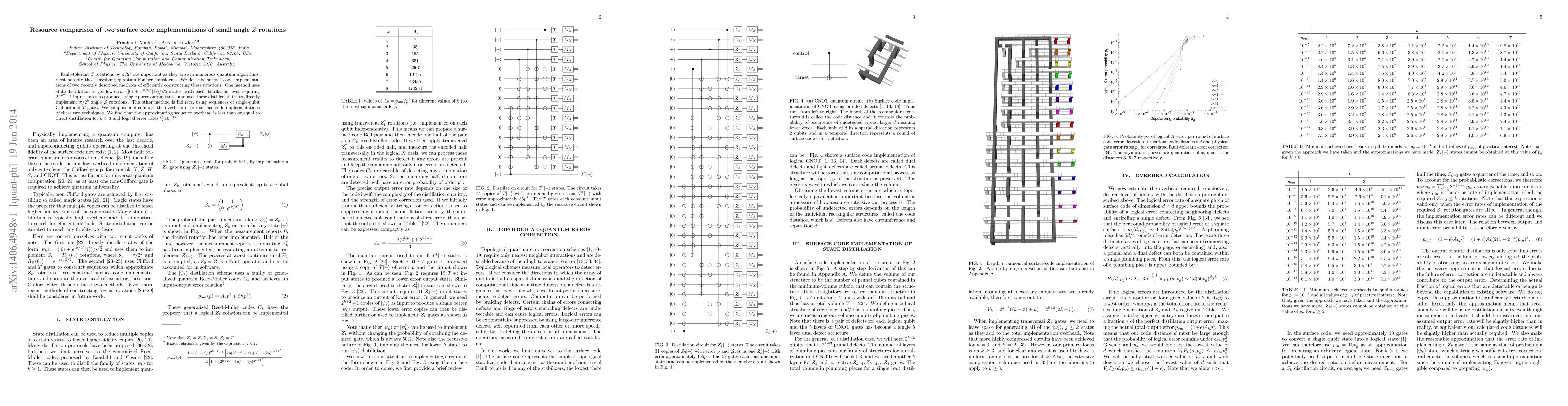 This paper compares the resource overhead of two surface code implementations for small angle Z rotations (π/2^k). The first method uses state distillation to produce low-error states, while the second employs sequences of single-qubit Clifford and T gates. The study finds that the indirect method has lower overhead for k > 3 when logical error rates are below ~10^-12.