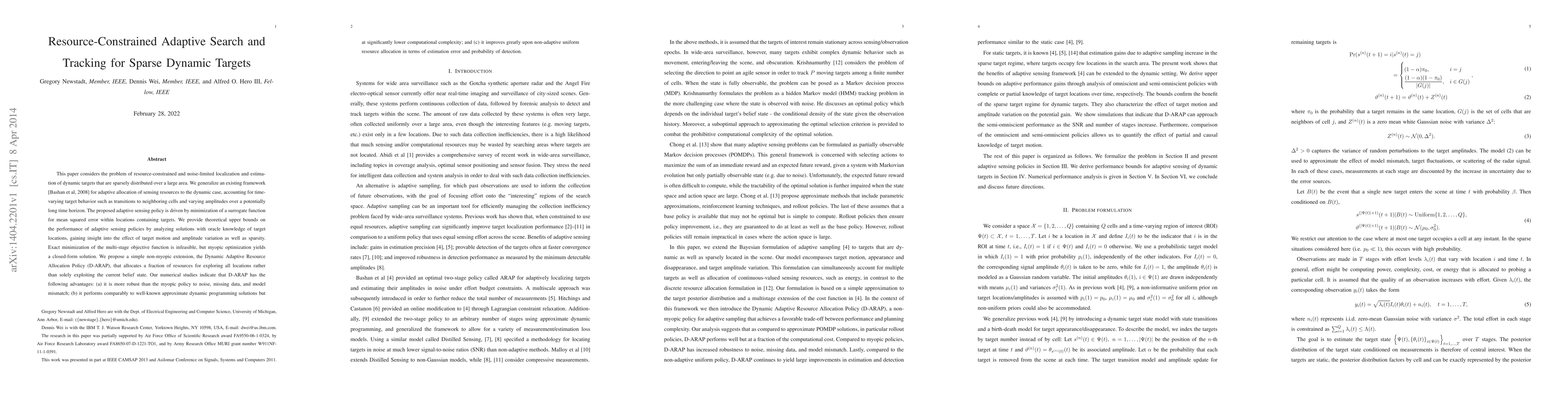 This paper proposes a resource-constrained adaptive search and tracking policy to localize sparse dynamic targets in noisy environments, offering improved robustness and efficiency compared to traditional methods.