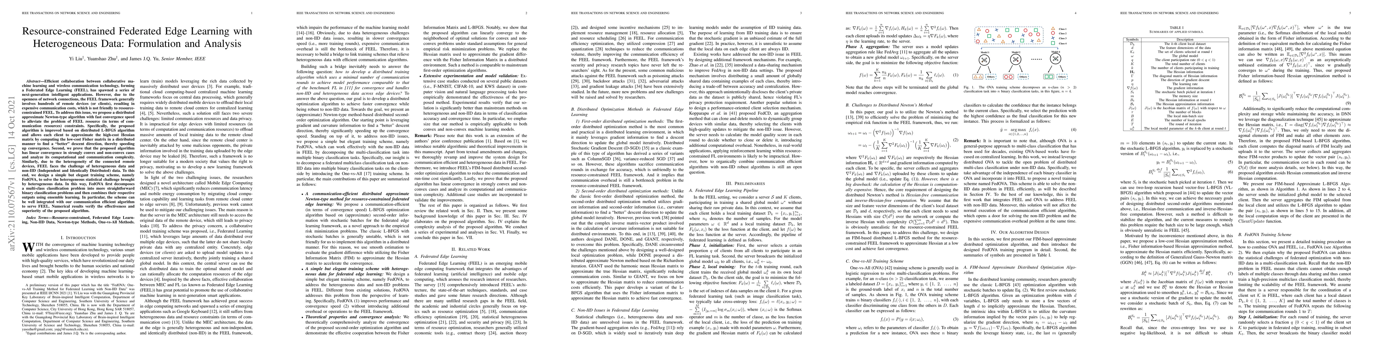 Efficient collaboration between collaborative machine learning and wireless communication technology, forming a Federated Edge Learning (FEEL), has spawned a series of next-generation intelligent applications. However, due to the openness of network connections, the FEEL framework generally involves hundreds of remote devices (or clients), resulting in expensive communication costs, which is not friendly to resource-constrained FEEL. To address this issue, we propose a distributed approximate Newton-type algorithm with fast convergence speed to alleviate the problem of FEEL resource (in terms of communication resources) constraints. Specifically, the proposed algorithm is improved based on distributed L-BFGS algorithm and allows each client to approximate the high-cost Hessian matrix by computing the low-cost Fisher matrix in a distributed manner to find a "better" descent direction, thereby speeding up convergence. Second, we prove that the proposed algorithm has linear convergence in strongly convex and non-convex cases and analyze its computational and communication complexity. Similarly, due to the heterogeneity of the connected remote devices, FEEL faces the challenge of heterogeneous data and non-IID (Independent and Identically Distributed) data. To this end, we design a simple but elegant training scheme, namely FedOVA, to solve the heterogeneous statistical challenge brought by heterogeneous data. In this way, FedOVA first decomposes a multi-class classification problem into more straightforward binary classification problems and then combines their respective outputs using ensemble learning. In particular, the scheme can be well integrated with our communication efficient algorithm to serve FEEL. Numerical results verify the effectiveness and superiority of the proposed algorithm.