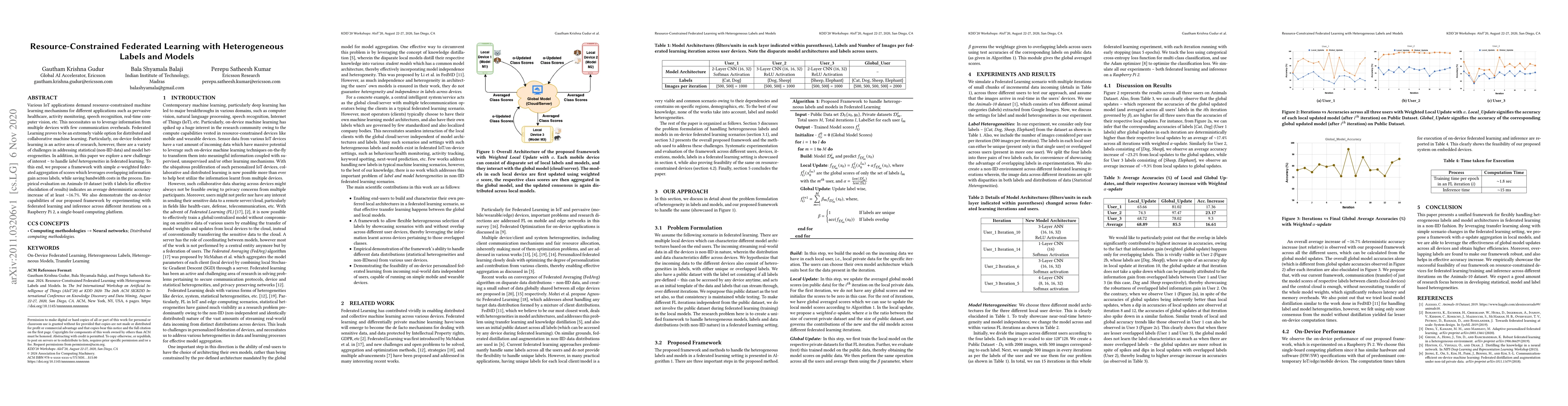 This paper proposes a resource-constrained federated learning framework to address label and model heterogeneities in IoT applications. The framework uses an $\alpha$-weighted aggregation method to enhance accuracy while minimizing communication overhead, achieving a ~16.7% accuracy improvement on the Animals-10 dataset and demonstrating on-device functionality via Raspberry Pi 2 experiments.