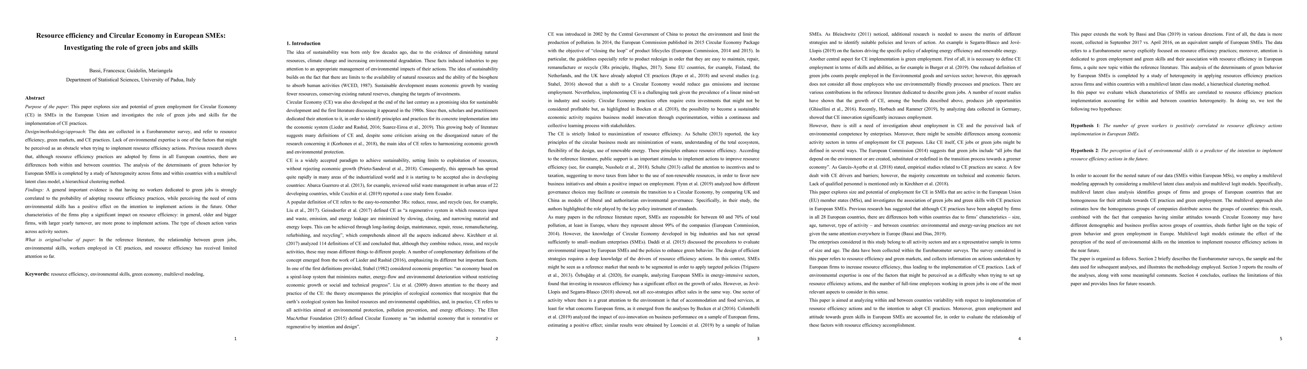 Purpose of the paper: This paper explores size and potential of green employment for Circular Economy (CE) in SMEs in the European Union and investigates the role of green jobs and skills for the implementation of CE practices. Design/methodology/approach: The data are collected in a Eurobarometer survey, and refer to resource efficiency, green markets, and CE practices. Lack of environmental expertise is one of the factors that might be perceived as an obstacle when trying to implement resource efficiency actions. Previous research shows that, although resource efficiency practices are adopted by firms in all European countries, there are differences both within and between countries. The analysis of the determinants of green behavior by European SMEs is completed by a study of heterogeneity across firms and within countries with a multilevel latent class model, a hierarchical clustering method. Findings: A general important evidence is that having no workers dedicated to green jobs is strongly correlated to the probability of adopting resource efficiency practices, while perceiving the need of extra environmental skills has a positive effect on the intention to implement actions in the future. Other characteristics of the firms play a significant impact on resource efficiency: in general, older and bigger firms, with larger yearly turnover, are more prone to implement actions. The type of chosen action varies across activity sectors. What is original/value of paper: In the reference literature, the relationship between green jobs, environmental skills, workers employed in CE practices, and resource efficiency has received limited attention so far.