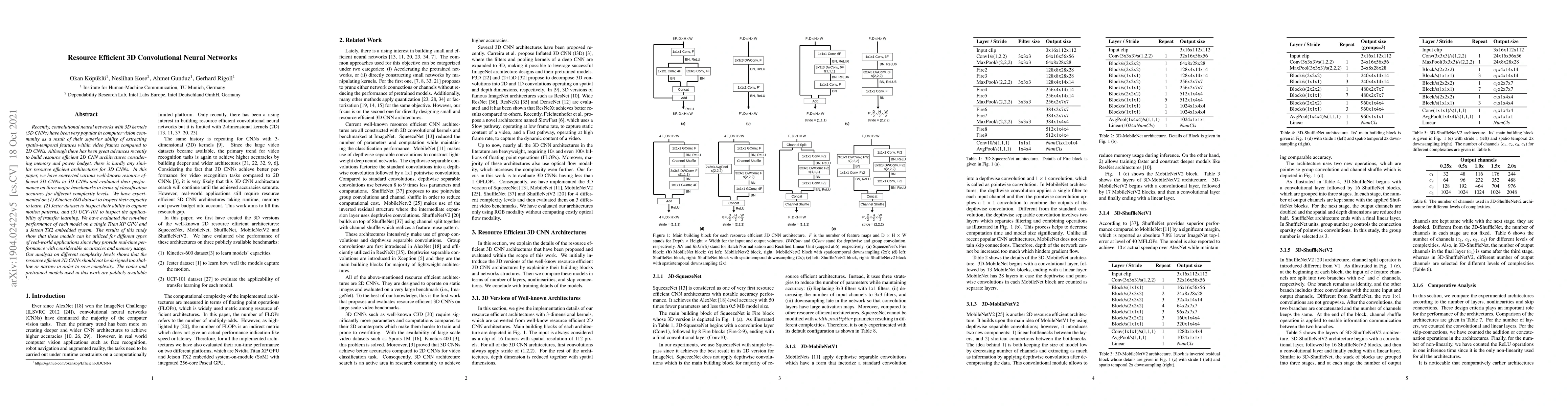 Proposes resource-efficient 3D CNN architectures by converting existing 2D models and evaluating their performance on various benchmarks.