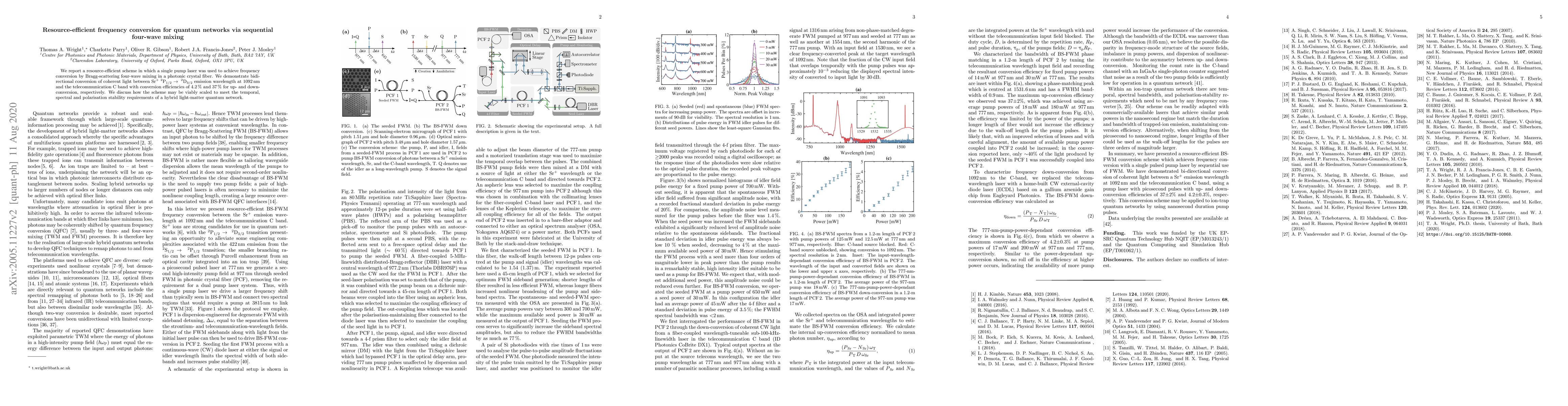 The paper proposes a resource-efficient method using a single pump laser for bidirectional frequency conversion via Bragg-scattering four-wave mixing in a photonic crystal fiber, achieving 4.2% up-conversion and 37% down-conversion efficiency. The scheme is potentially scalable to meet quantum network stability requirements.