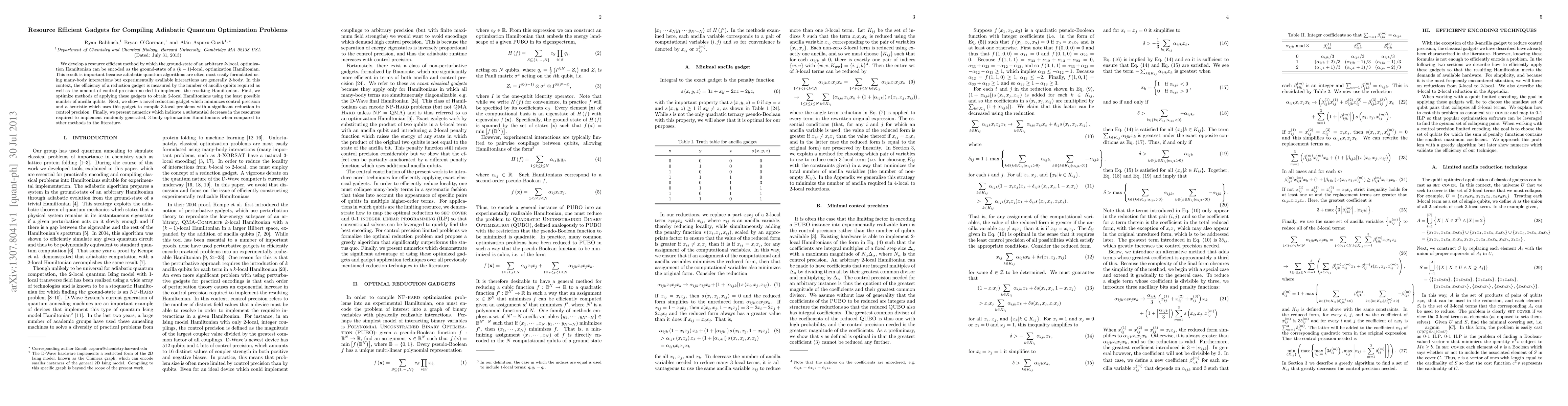 We develop a resource efficient method by which the ground-state of an arbitrary k-local, optimization Hamiltonian can be encoded as the ground-state of a (k-1)-local optimization Hamiltonian. This result is important because adiabatic quantum algorithms are often most easily formulated using many-body interactions but experimentally available interactions are generally 2-body. In this context, the efficiency of a reduction gadget is measured by the number of ancilla qubits required as well as the amount of control precision needed to implement the resulting Hamiltonian. First, we optimize methods of applying these gadgets to obtain 2-local Hamiltonians using the least possible number of ancilla qubits. Next, we show a novel reduction gadget which minimizes control precision and a heuristic which uses this gadget to compile 3-local problems with a significant reduction in control precision. Finally, we present numerics which indicate a substantial decrease in the resources required to implement randomly generated, 3-body optimization Hamiltonians when compared to other methods in the literature.