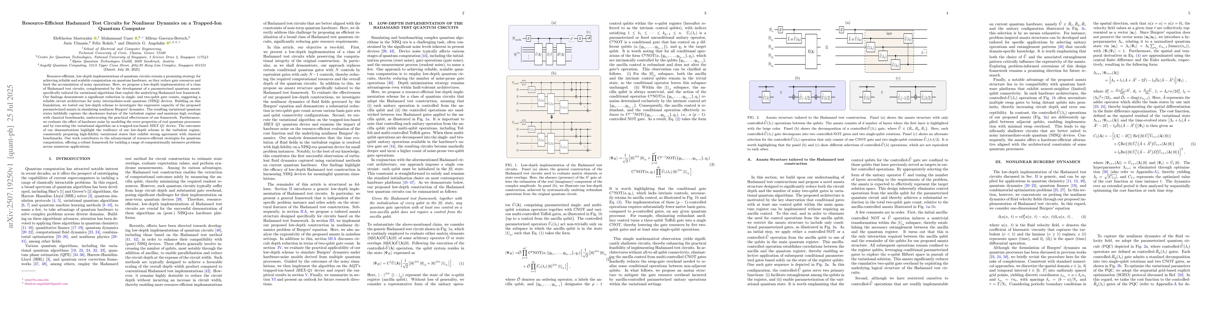 Resource-efficient, low-depth implementations of quantum circuits remain a promising strategy for achieving reliable and scalable computation on quantum hardware, as they reduce gate resources and limit the accumulation of noisy operations. Here, we propose a low-depth implementation of a class of Hadamard test circuits, complemented by the development of a parameterized quantum ansatz specifically tailored for variational algorithms that exploit the underlying Hadamard test framework. Our findings demonstrate a significant reduction in single- and two-qubit gate counts, suggesting a reliable circuit architecture for noisy intermediate-scale quantum (NISQ) devices. Building on this foundation, we tested our low-depth scheme to investigate the expressive capacity of the proposed parameterized ansatz in simulating nonlinear Burgers' dynamics. The resulting variational quantum states faithfully capture the shockwave feature of the turbulent regime and maintain high overlaps with classical benchmarks, underscoring the practical effectiveness of our framework. Furthermore, we evaluate the effect of hardware noise by modeling the error properties of real quantum processors and by executing the variational algorithm on a trapped-ion-based IBEX Q1 device. The outcomes of our demonstrations highlight the resilience of our low-depth scheme in the turbulent regime, consistently preparing high-fidelity variational states that exhibit strong agreement with classical benchmarks. Our work contributes to the advancement of resource-efficient strategies for quantum computation, offering a robust framework for tackling a range of computationally intensive problems across numerous applications.