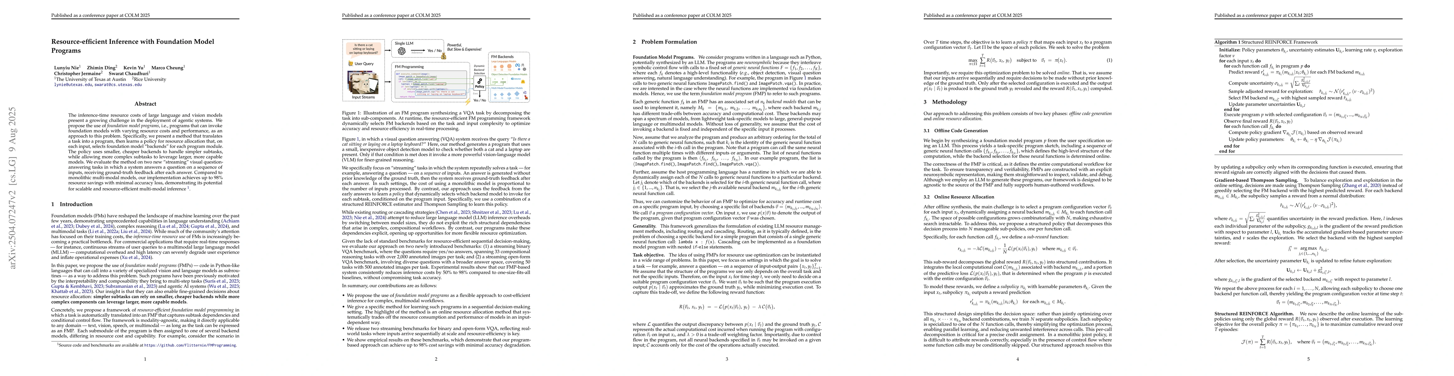 The inference-time resource costs of large language and vision models present a growing challenge in production deployments. We propose the use of foundation model programs, i.e., programs that can invoke foundation models with varying resource costs and performance, as an approach to this problem. Specifically, we present a method that translates a task into a program, then learns a policy for resource allocation that, on each input, selects foundation model "backends" for each program module. The policy uses smaller, cheaper backends to handle simpler subtasks, while allowing more complex subtasks to leverage larger, more capable models. We evaluate the method on two new "streaming" visual question-answering tasks in which a system answers a question on a sequence of inputs, receiving ground-truth feedback after each answer. Compared to monolithic multi-modal models, our implementation achieves up to 98% resource savings with minimal accuracy loss, demonstrating its potential for scalable and resource-efficient multi-modal inference.
