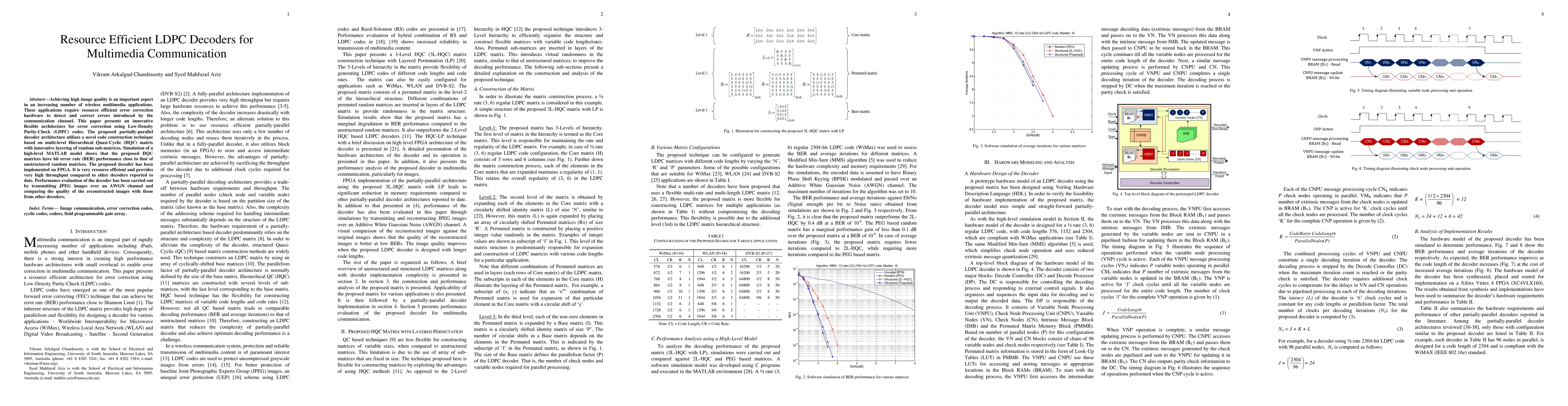This paper proposes a resource-efficient LDPC decoder architecture for multimedia communication, utilizing a novel multi-level Hierarchical Quasi-Cyclic matrix. The decoder demonstrates high throughput and comparable bit error rate performance, effectively enhancing image quality in wireless applications.