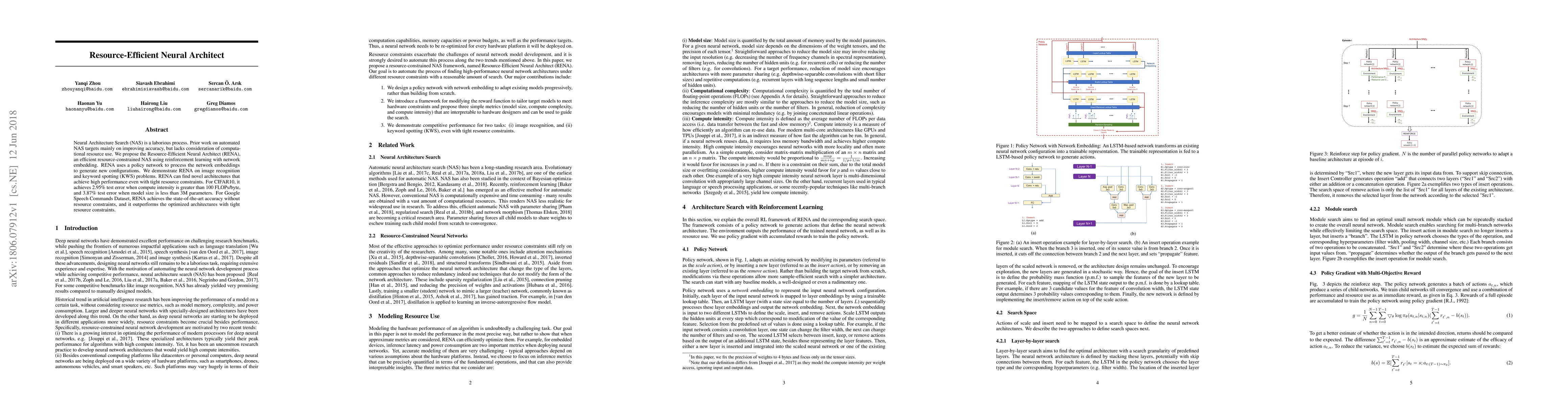Researchers propose a new neural architecture search method called Resource-Efficient Neural Architect (RENA) that optimizes performance while minimizing computational resources, achieving state-of-the-art accuracy in image recognition and keyword spotting tasks.
