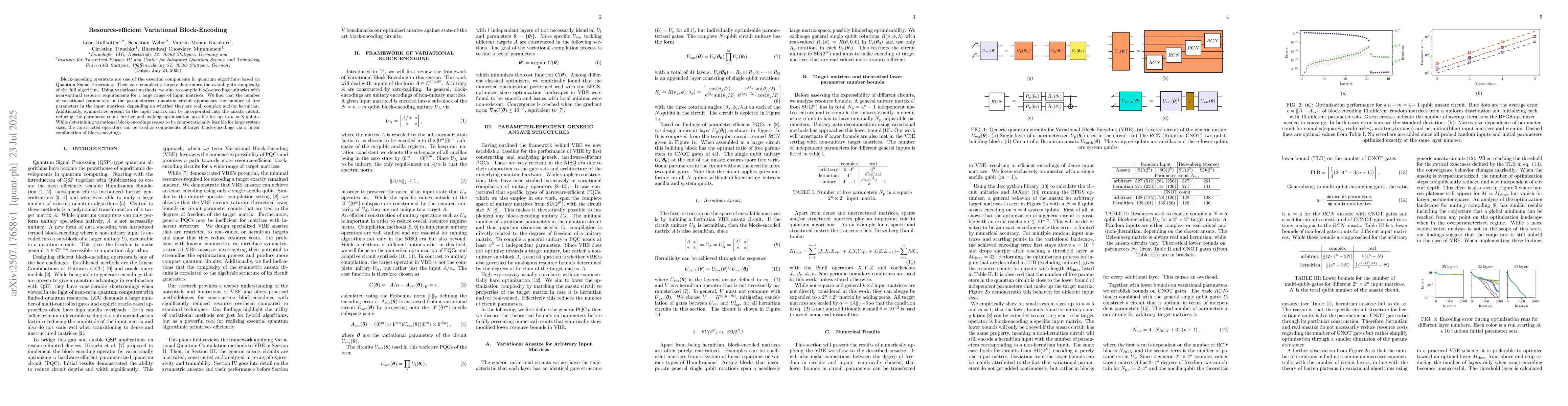 Block-encoding operators are one of the essential components in quantum algorithms based on Quantum Signal Processing. Their gate complexity largely determines the overall gate complexity of the full algorithm. Using variational methods, we aim to compile block-encoding unitaries with near-optimal resource requirements for a large range of input matrices. We find that the number of variational parameters in the parameterized quantum circuit approaches the number of free parameters in the input matrices, depending on whether they are real, complex and/or hermitian. Additionally, symmetries present in the input matrix can be incorporated into the ansatz circuit, reducing the parameter count further and making optimization possible for up to n=8 qubits. While determining variational block-encodings ceases to be computationally feasible for large system sizes, the constructed operators can be used as components of larger block-encodings via a linear combination of block-encodings.