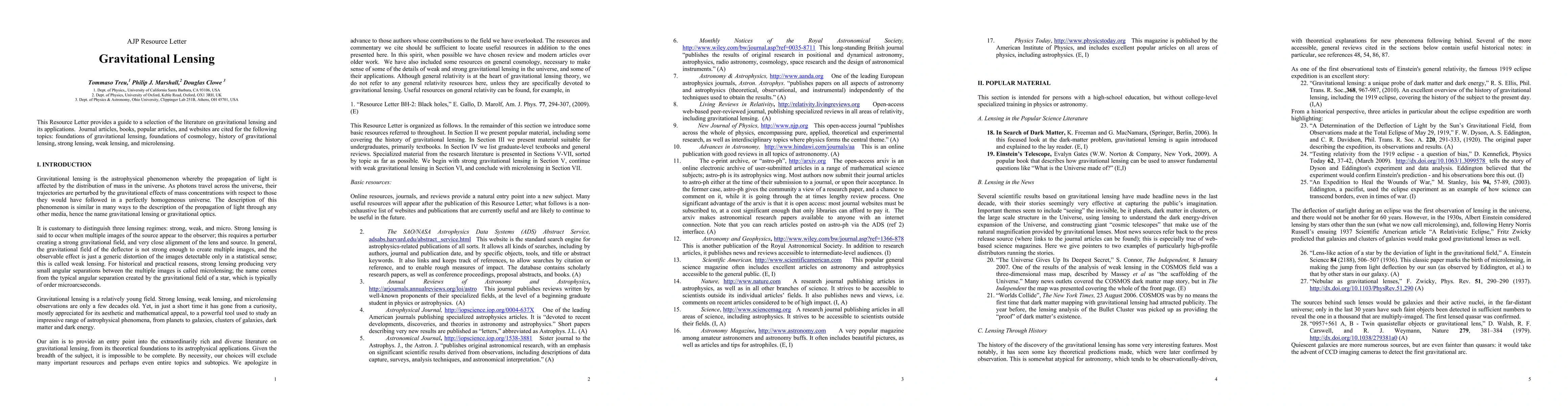 This Resource Letter offers a comprehensive guide to gravitational lensing literature, covering foundational aspects, cosmology, history, and various applications including strong, weak, and microlensing. It cites journal articles, books, popular articles, and websites for easy reference.