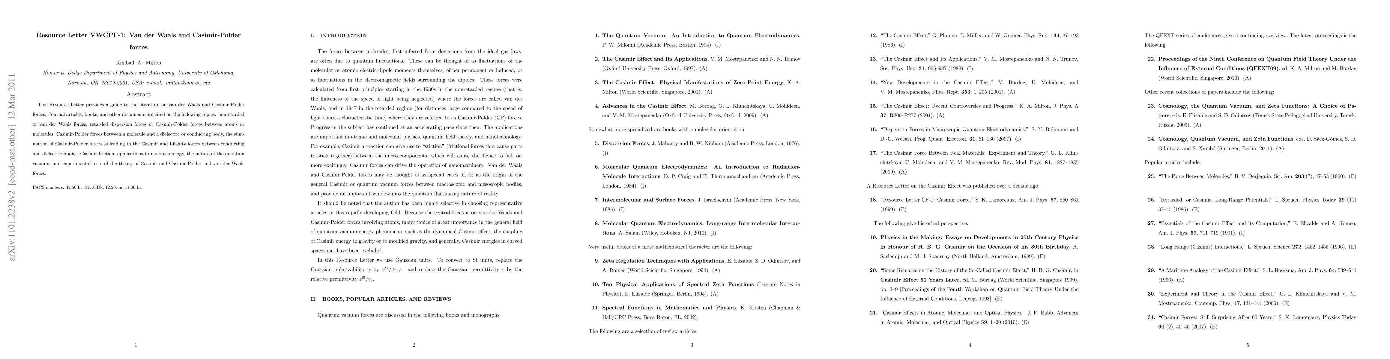 This Resource Letter catalogs literature on van der Waals and Casimir-Polder forces, covering theoretical and experimental aspects, including interactions between atoms/molecules and with dielectric/conducting bodies, and applications in nanotechnology. It also discusses the quantum vacuum's nature and experimental validations.