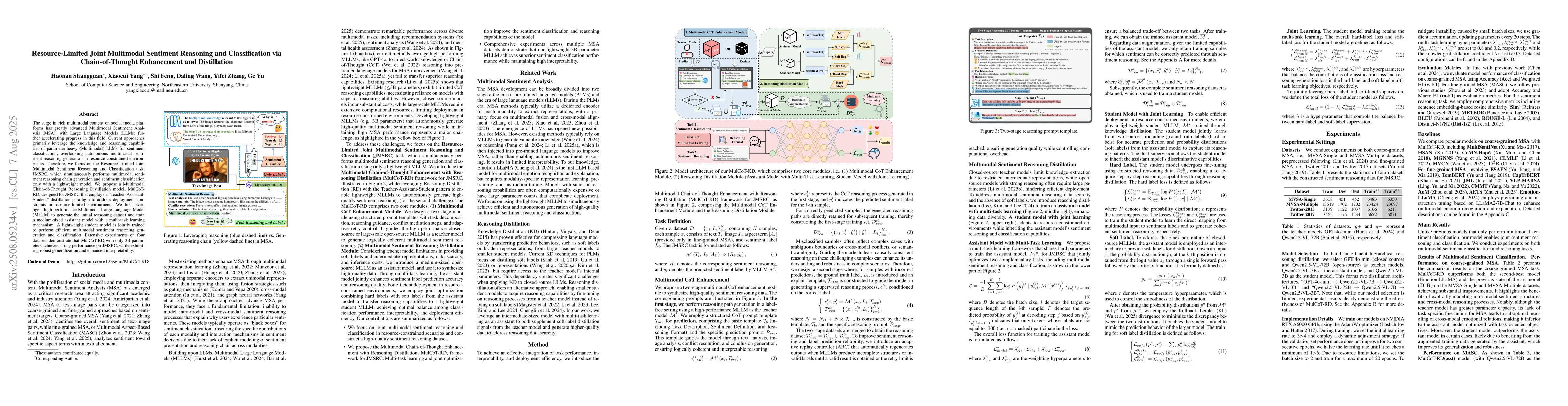This research is significant as it addresses the dual challenges of reasoning interpretability and efficient deployment in resource-limited scenarios by introducing MulCoT-RD, a lightweight yet effective framework for joint multimodal sentiment reasoning and classification.