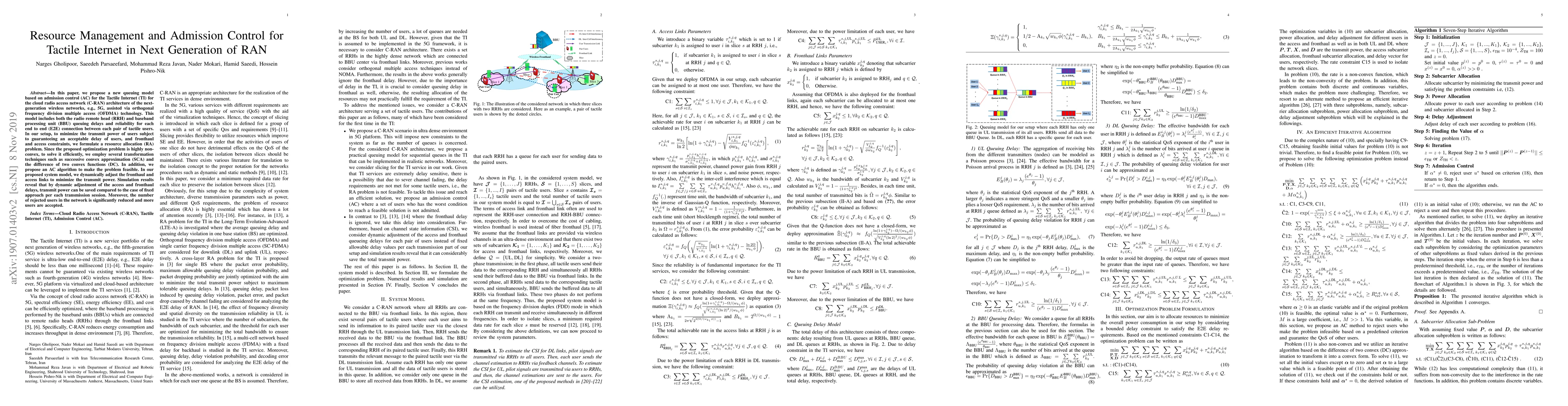This paper proposes a new queuing model for Tactile Internet in 5G C-RAN architecture, incorporating RRH and BBU delays. It formulates a resource allocation problem to minimize user transmit power while ensuring acceptable delay and link limitations, using SCA and DC techniques. An admission control algorithm is also introduced to enhance feasibility, and simulations show reduced transmit power and higher user acceptance rates through dynamic adjustment of fronthaul and access links.