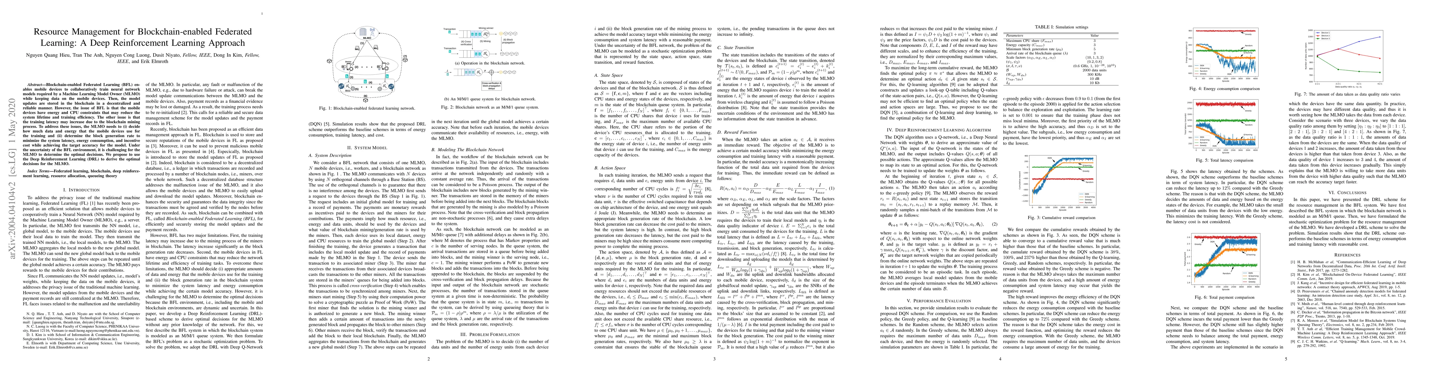 Blockchain-enabled Federated Learning (BFL) enables mobile devices to collaboratively train neural network models required by a Machine Learning Model Owner (MLMO) while keeping data on the mobile devices. Then, the model updates are stored in the blockchain in a decentralized and reliable manner. However, the issue of BFL is that the mobile devices have energy and CPU constraints that may reduce the system lifetime and training efficiency. The other issue is that the training latency may increase due to the blockchain mining process. To address these issues, the MLMO needs to (i) decide how much data and energy that the mobile devices use for the training and (ii) determine the block generation rate to minimize the system latency, energy consumption, and incentive cost while achieving the target accuracy for the model. Under the uncertainty of the BFL environment, it is challenging for the MLMO to determine the optimal decisions. We propose to use the Deep Reinforcement Learning (DRL) to derive the optimal decisions for the MLMO.
