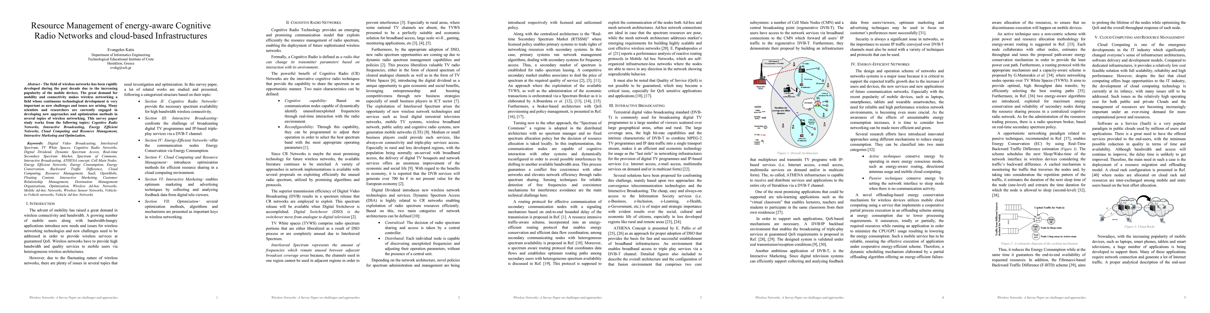 The field of wireless networks has been rapidly developed during the past decade due to the increasing popularity of the mobile devices. The great demand for mobility and connectivity makes wireless networking a field whose continuous technological development is very important as new challenges and issues are arising. Many scientists and researchers are currently engaged in developing new approaches and optimization methods in several topics of wireless networking. This survey paper study works from the following topics: Cognitive Radio Networks, Interactive Broadcasting, Energy Efficient Networks, Cloud Computing and Resource Management, Interactive Marketing and Optimization.