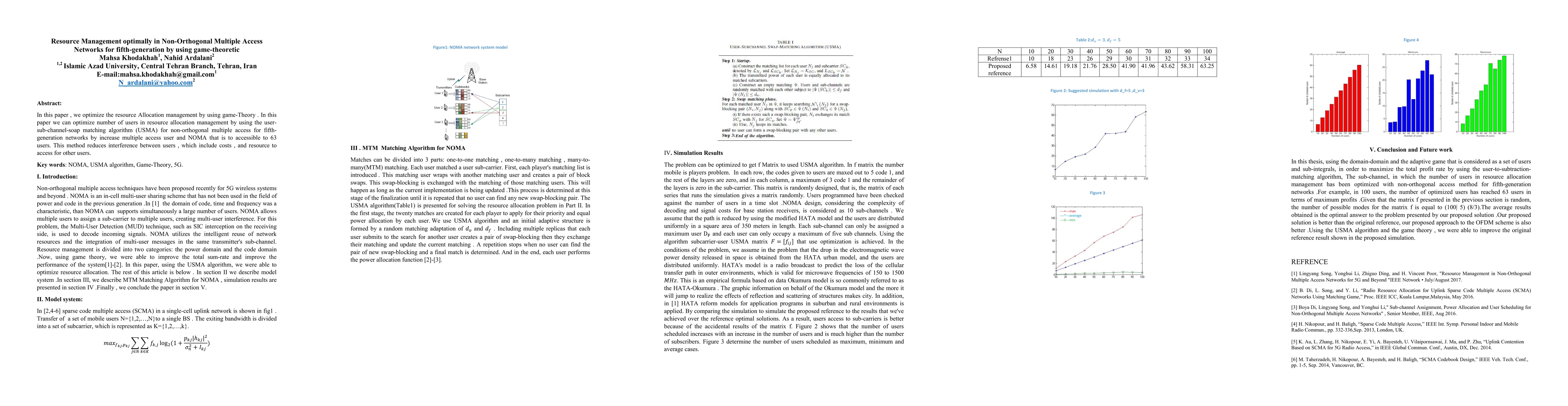 In this paper , we optimize the resource Allocation management by using game-Theory . In this paper we can optimize number of users in resource allocation management by using the user-sub-channel-soap matching algorithm (USMA) for non-orthogonal multiple access for fifth-generation networks by increase multiple access user and NOMA that is to accessible to 63 users. This method reduces interference between users , which include costs , and resource to access for other users.