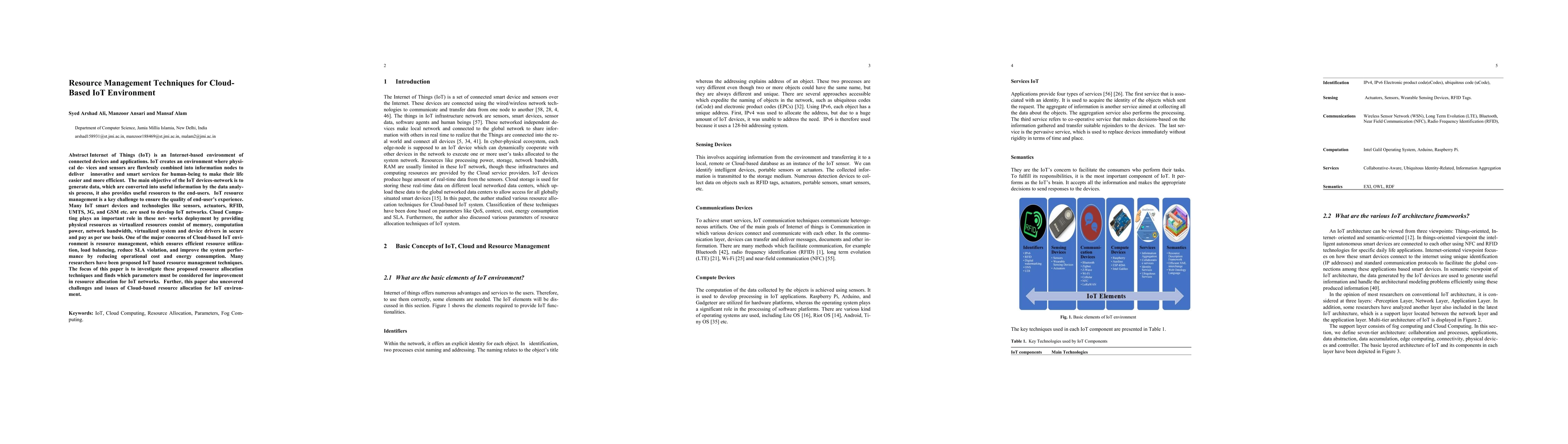 This paper investigates resource management techniques for cloud-based IoT environments, focusing on efficient resource allocation, load balancing, and reduced operational costs. It identifies key parameters and challenges in resource allocation to enhance the quality of end user experience in IoT networks.