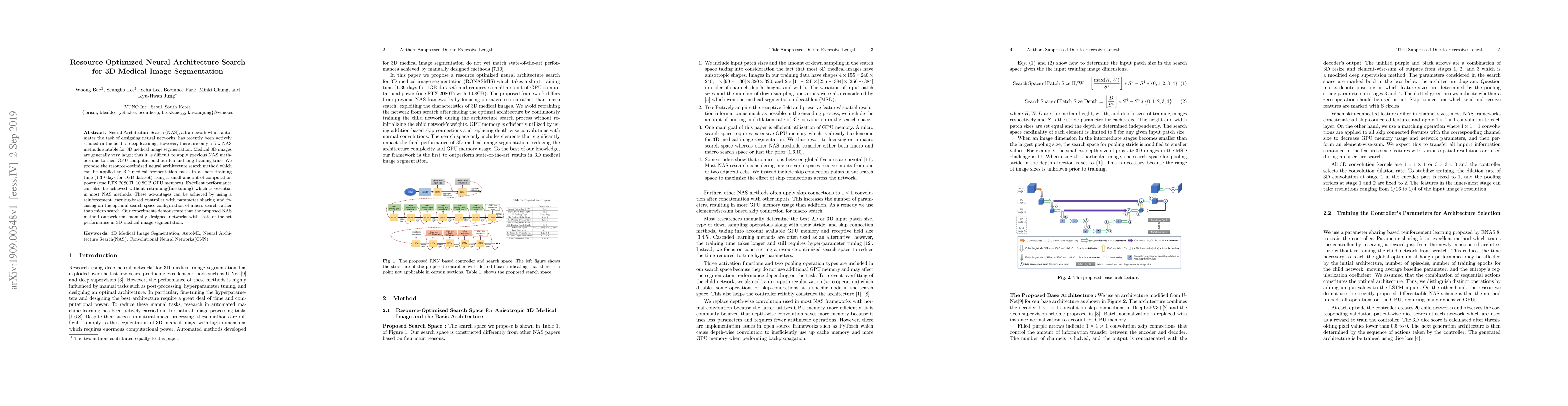 This paper proposes a resource-optimized neural architecture search method for 3D medical image segmentation, achieving excellent performance in a short training time using minimal computational resources. The method leverages reinforcement learning with parameter sharing and focuses on macro search space configuration, outperforming manually designed networks.