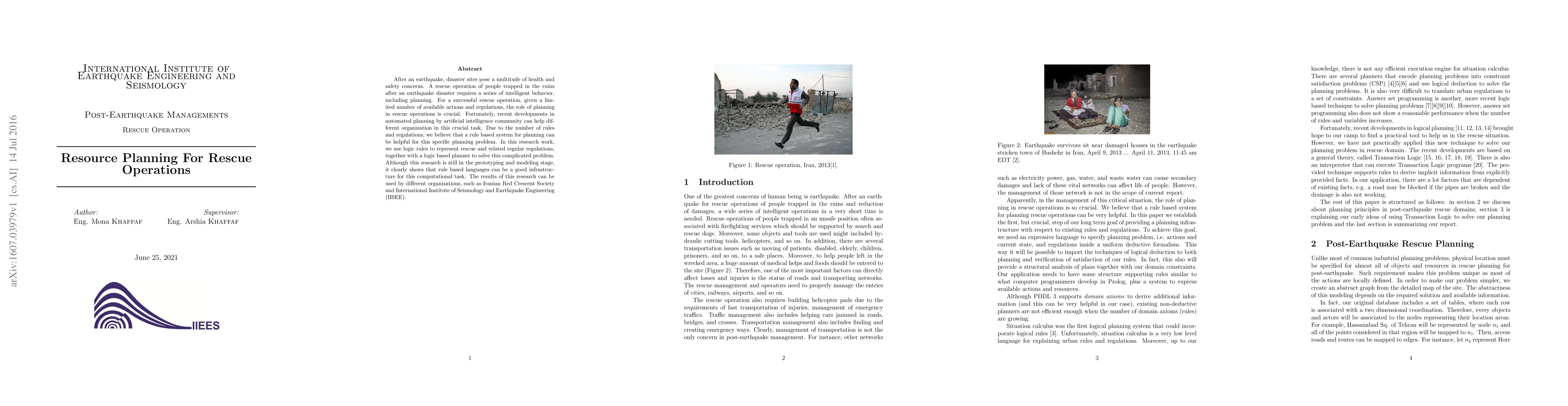 After an earthquake, disaster sites pose a multitude of health and safety concerns. A rescue operation of people trapped in the ruins after an earthquake disaster requires a series of intelligent behavior, including planning. For a successful rescue operation, given a limited number of available actions and regulations, the role of planning in rescue operations is crucial. Fortunately, recent developments in automated planning by artificial intelligence community can help different organization in this crucial task. Due to the number of rules and regulations, we believe that a rule based system for planning can be helpful for this specific planning problem. In this research work, we use logic rules to represent rescue and related regular regulations, together with a logic based planner to solve this complicated problem. Although this research is still in the prototyping and modeling stage, it clearly shows that rule based languages can be a good infrastructure for this computational task. The results of this research can be used by different organizations, such as Iranian Red Crescent Society and International Institute of Seismology and Earthquake Engineering (IISEE).