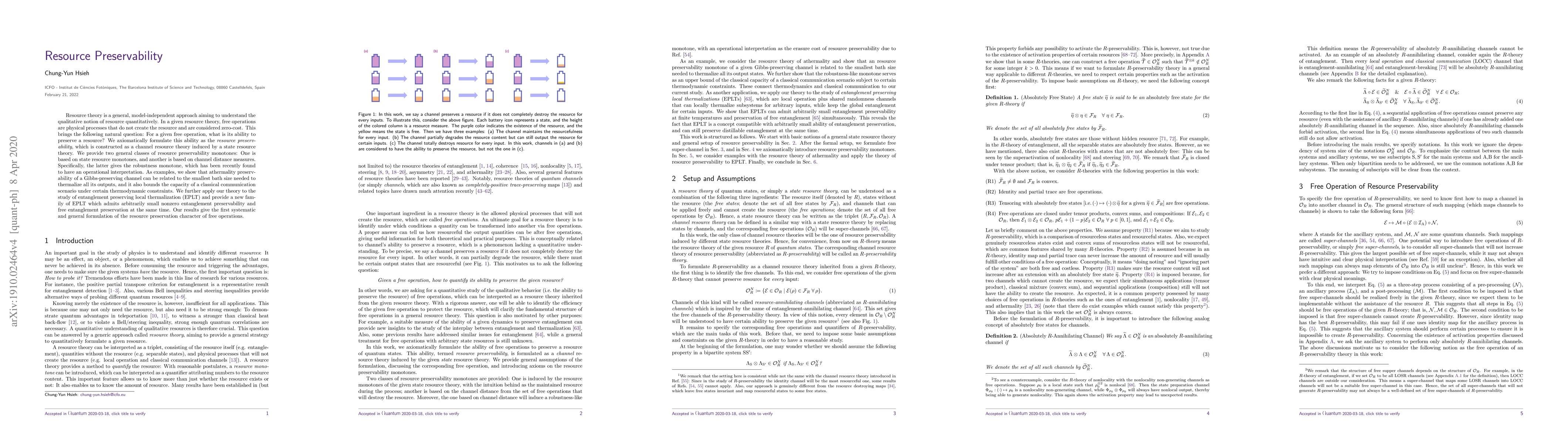 This paper introduces a framework for quantifying the ability of free operations to preserve resources, termed resource preservability, within resource theory. It provides two classes of resource preservability monotones and applies the theory to entanglement preserving local thermalization, revealing new insights into the preservation of entanglement under thermal operations.