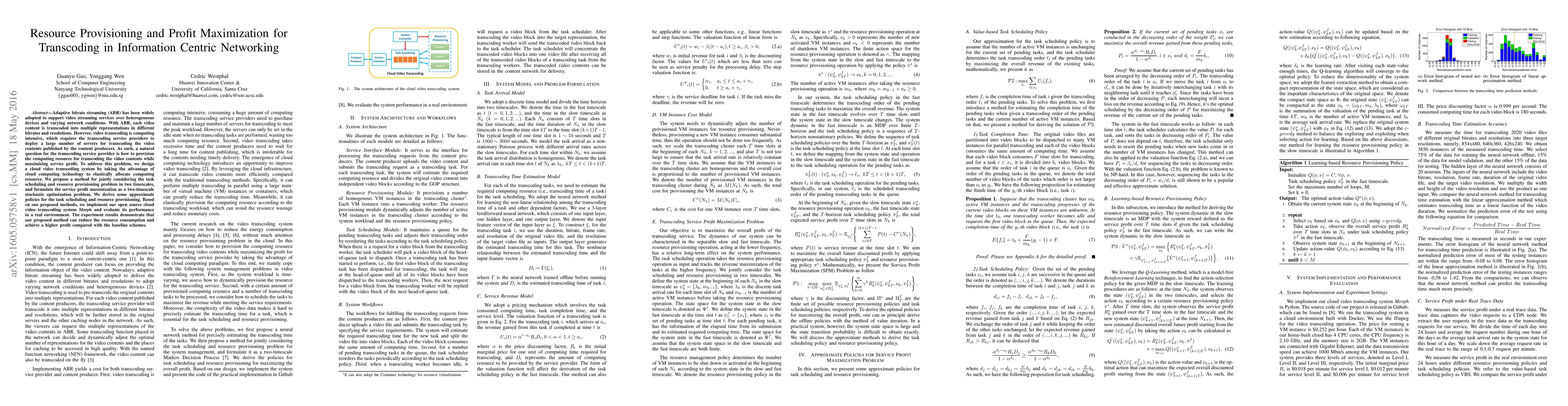 This paper proposes a method to optimize resource provisioning and profit maximization for video transcoding in cloud-based information centric networking, formulating the problem as a two-timescale stochastic optimization. The authors implement and evaluate their open-source cloud transcoding system, Morph, demonstrating reduced resource usage and higher profit compared to baseline methods.