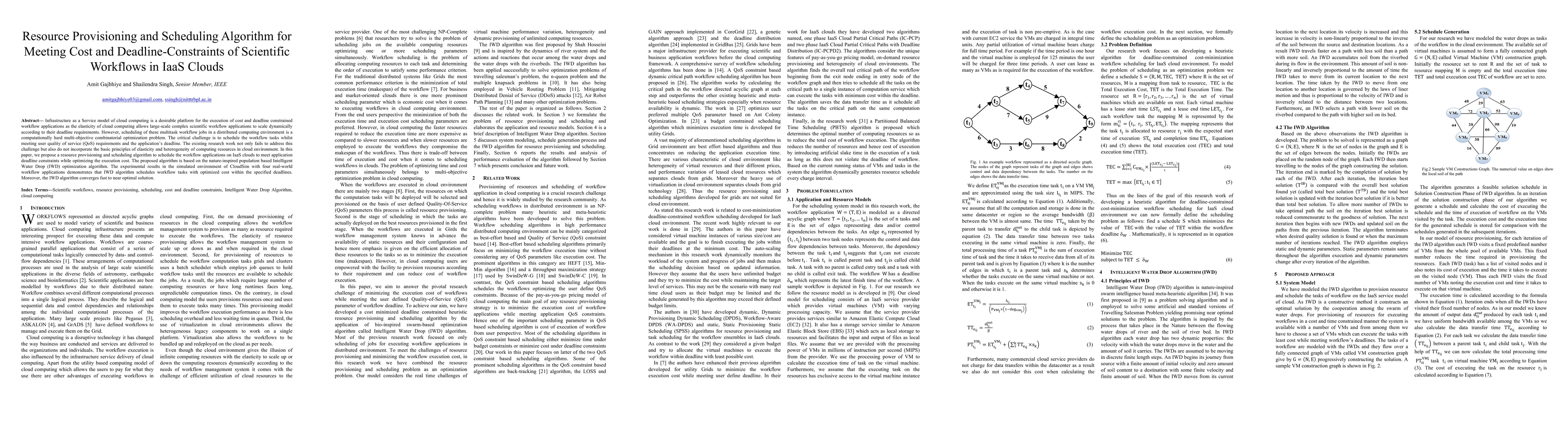 This paper proposes an Intelligent Water Drop (IWD) optimization algorithm for scheduling scientific workflows in IaaS clouds to meet cost and deadline constraints, incorporating cloud resource elasticity. Experimental results using CloudSim show the algorithm effectively optimizes cost while meeting deadlines and converges quickly to near-optimal solutions.