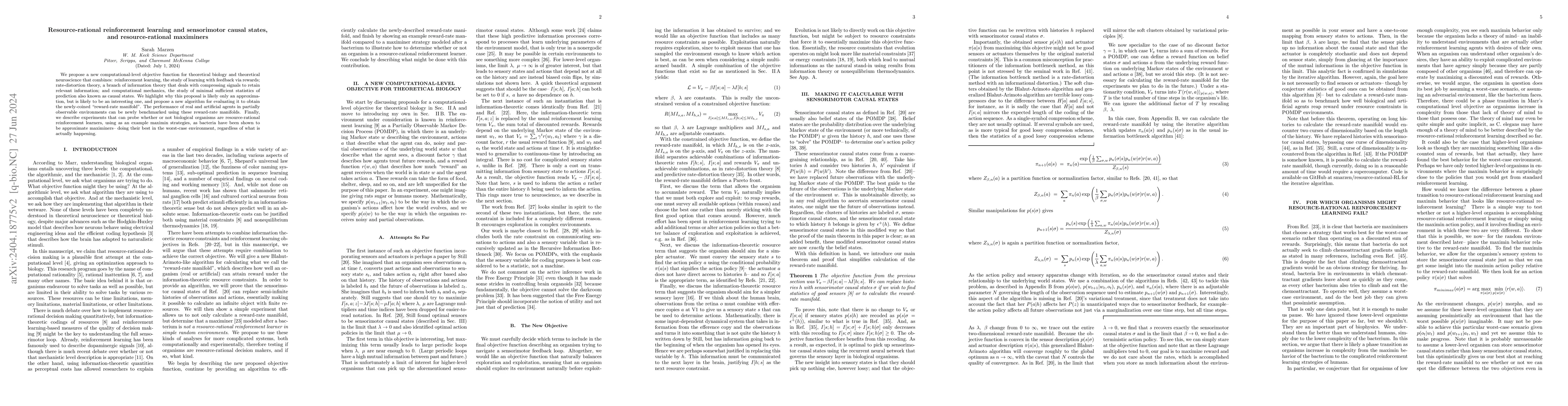 We propose a new computational-level objective function for theoretical biology and theoretical neuroscience that combines: reinforcement learning, the study of learning with feedback via rewards; rate-distortion theory, a branch of information theory that deals with compressing signals to retain relevant information; and computational mechanics, the study of minimal sufficient statistics of prediction also known as causal states. We highlight why this proposal is likely only an approximation, but is likely to be an interesting one, and propose a new algorithm for evaluating it to obtain the newly-coined ``reward-rate manifold''. The performance of real and artificial agents in partially observable environments can be newly benchmarked using these reward-rate manifolds. Finally, we describe experiments that can probe whether or not biological organisms are resource-rational reinforcement learners, using as an example maximin strategies, as bacteria have been shown to be approximate maximiners -- doing their best in the worst-case environment, regardless of what is actually happening.