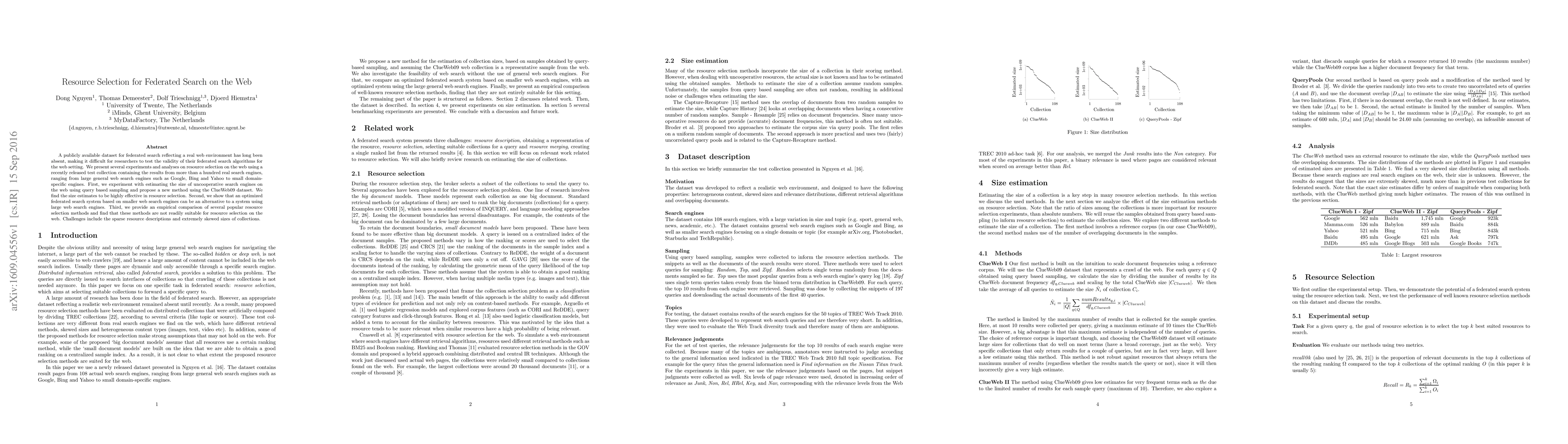 This paper introduces a new dataset for federated search on the web and evaluates resource selection methods using real search engines. It finds that smaller search engines can be effective and that existing resource selection methods are inadequate for the web's unique challenges.