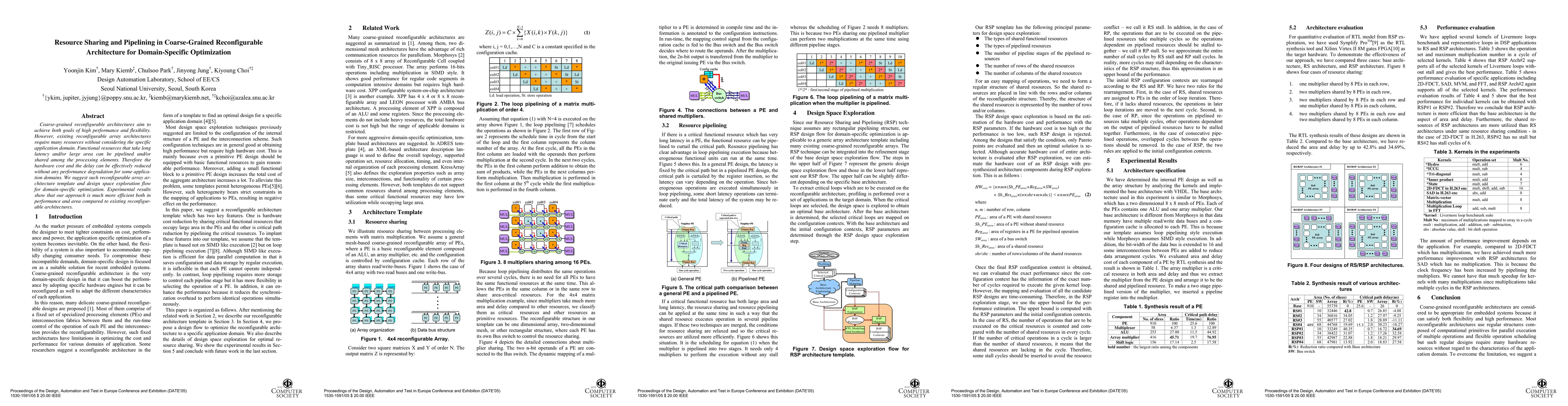 This paper proposes a coarse-grained reconfigurable architecture template that optimizes resource sharing and pipelining to reduce hardware cost and delay for specific application domains, achieving better performance and area efficiency compared to existing architectures. Experimental results validate the effectiveness of the suggested design approach.