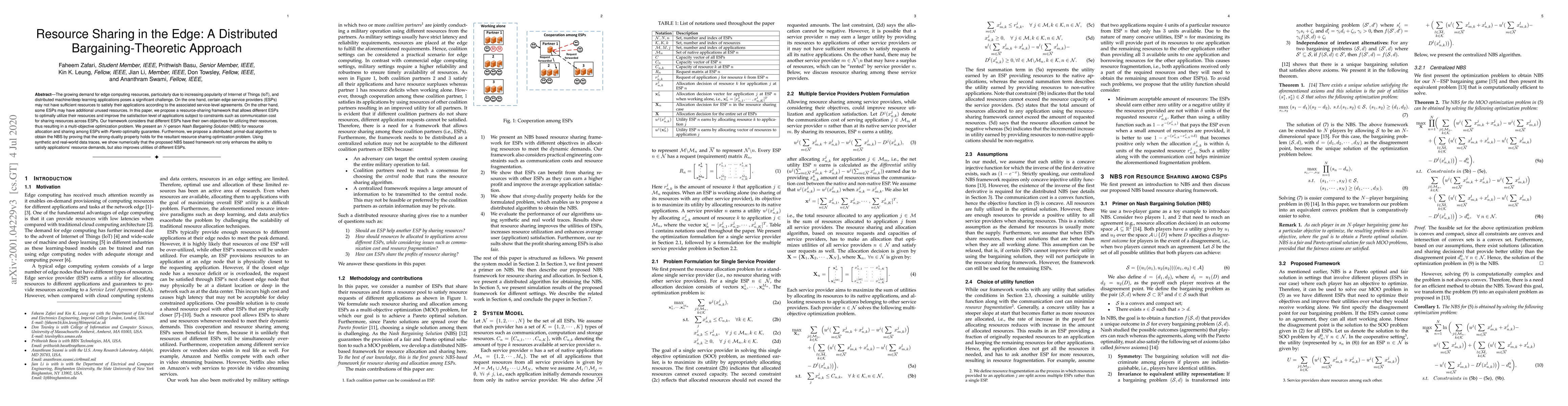 The growing demand for edge computing resources, particularly due to increasing popularity of Internet of Things (IoT), and distributed machine/deep learning applications poses a significant challenge. On the one hand, certain edge service providers (ESPs) may not have sufficient resources to satisfy their applications according to the associated service-level agreements. On the other hand, some ESPs may have additional unused resources. In this paper, we propose a resource-sharing framework that allows different ESPs to optimally utilize their resources and improve the satisfaction level of applications subject to constraints such as communication cost for sharing resources across ESPs. Our framework considers that different ESPs have their own objectives for utilizing their resources, thus resulting in a multi-objective optimization problem. We present an $N$-person \emph{Nash Bargaining Solution} (NBS) for resource allocation and sharing among ESPs with \emph{Pareto} optimality guarantee. Furthermore, we propose a \emph{distributed}, primal-dual algorithm to obtain the NBS by proving that the strong-duality property holds for the resultant resource sharing optimization problem. Using synthetic and real-world data traces, we show numerically that the proposed NBS based framework not only enhances the ability to satisfy applications' resource demands, but also improves utilities of different ESPs.