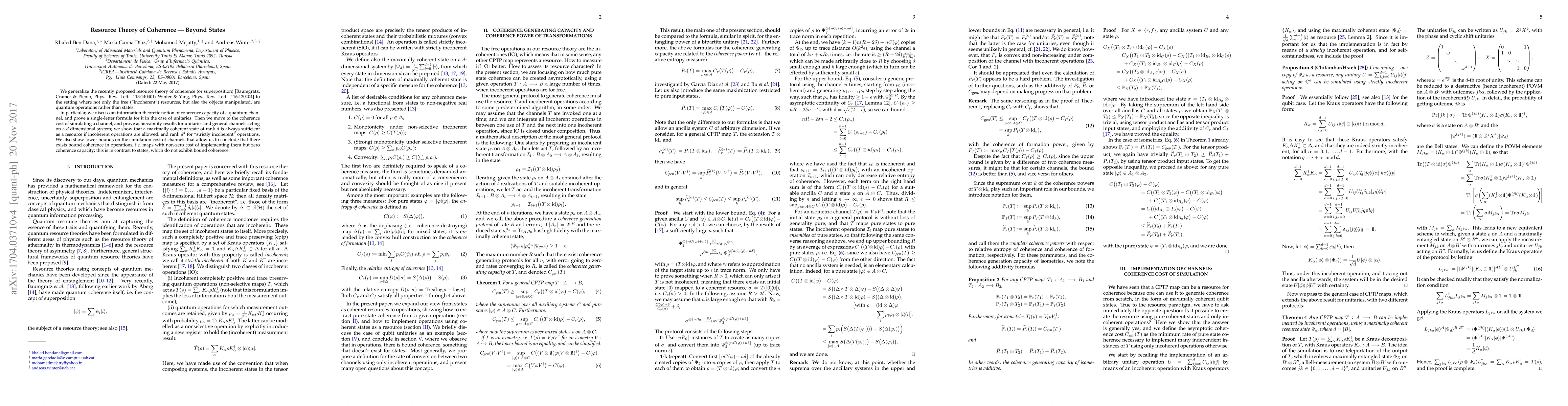 This paper extends resource theory of coherence to quantum channels and operations, introducing a coherence capacity formula for unitaries and proving achievability results for simulating channels with incoherent operations.
