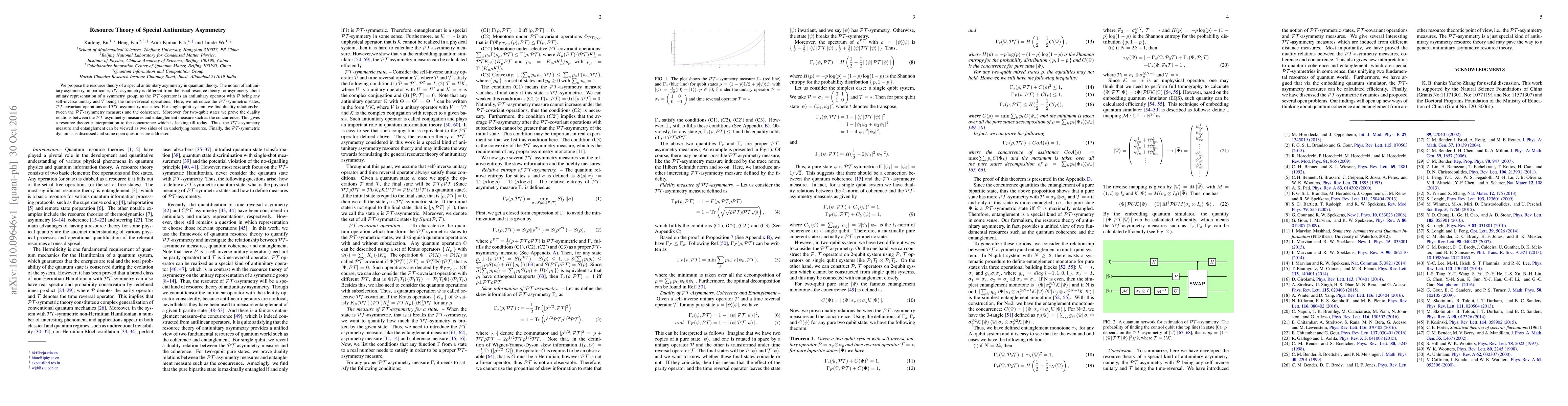 This paper introduces a resource theory of special antiunitary asymmetry, specifically ${\cal PT}$-asymmetry, in quantum mechanics. It establishes ${\cal PT}$-symmetric states, ${\cal PT}$-covariant operations, and ${\cal PT}$-asymmetry measures, and reveals dual relationships between ${\cal PT}$-asymmetry and coherence in single qubits and entanglement in two-qubit systems.